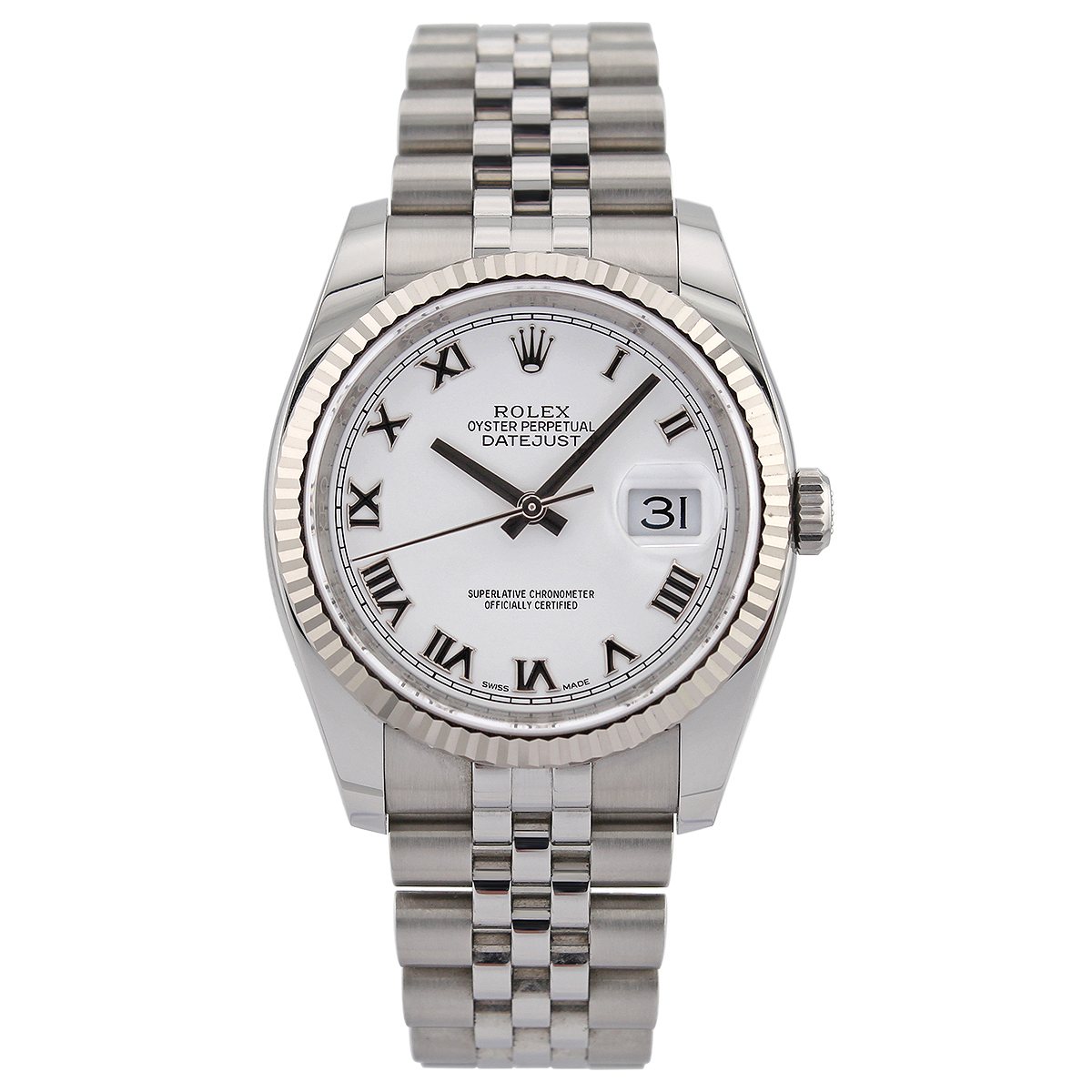 This Rolex Datejust 116234 has a white roman numeral dial and a bracelet strap. This Rolex has undergone a thorough inspection of water resistance, accuracy, functionality and condition to determine the level of reconditioning required to meet our strict standards. It has also been referenced against technical documents and manufacturer records where available to ensure authenticity and a clean history. All our watches have a 24-month warranty for your peace of mind. One of our skilled polishing technicians has removed marks on the case and bracelet of this watch, brought about by daily wear and tear, which is why this watch does not come with the remaining manufacturer’s warranty.