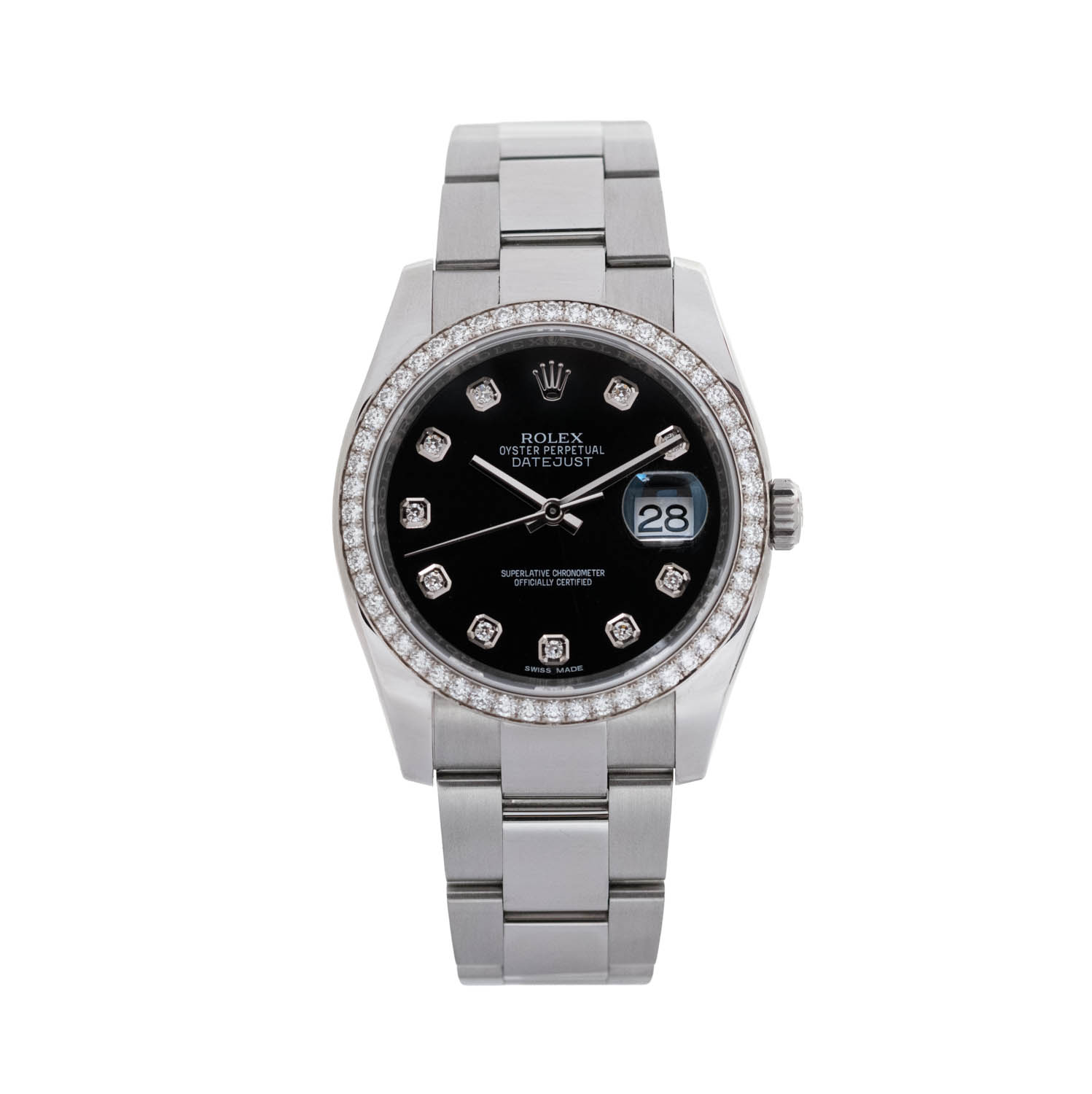 This Rolex Datejust 116244 has a black diamond dial and a bracelet strap. This Rolex has undergone a thorough inspection of water resistance, accuracy, functionality and condition to determine the level of reconditioning required to meet our strict standards. It has also been referenced against technical documents and manufacturer records where available to ensure authenticity and a clean history. All our watches have a 24-month warranty for your peace of mind. One of our skilled polishing technicians has removed marks on the case and bracelet of this watch, brought about by daily wear and tear, which is why this watch does not come with the remaining manufacturer’s warranty.