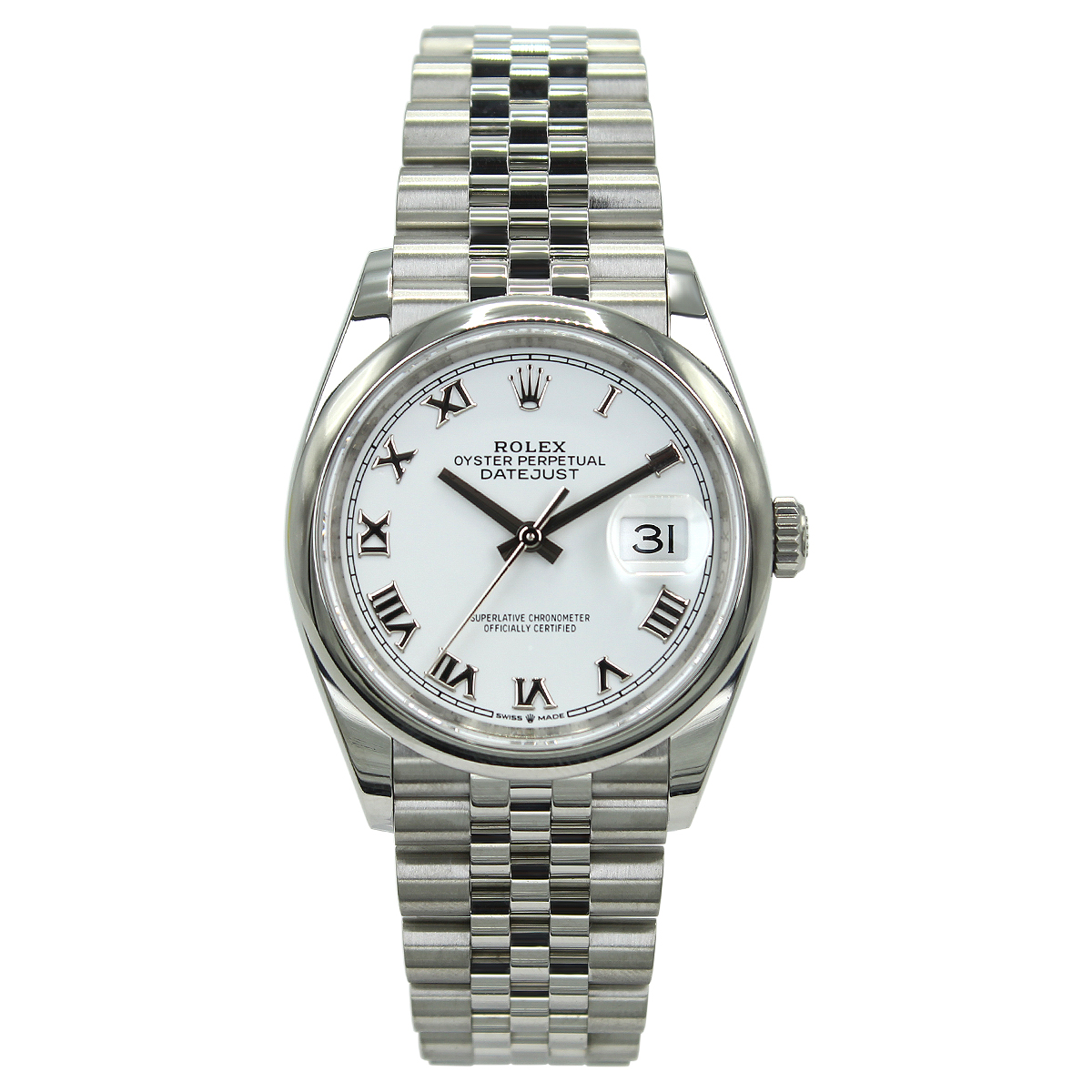 This Rolex Datejust 126200 has a white roman numeral dial and a bracelet strap. This Rolex has undergone a thorough inspection of water resistance, accuracy, functionality and condition to determine the level of reconditioning required to meet our strict standards. It has also been referenced against technical documents and manufacturer records where available to ensure authenticity and a clean history. Our watches have a 24-month warranty for your peace of mind, in conjunction with any remaining manufacturer’s warranty from new or from service. To maintain the manufacturer’s warranty on this watch, it has not been polished in our service centre.