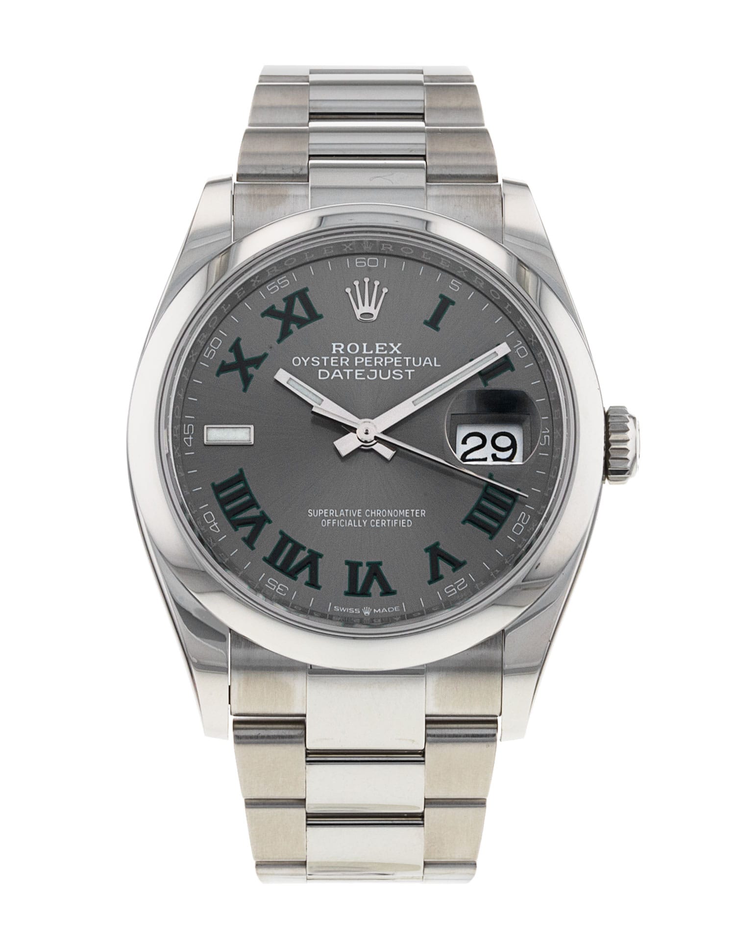 This Rolex Datejust 126200 has a slate roman numeral dial and a bracelet strap. This Rolex has undergone a thorough inspection of water resistance, accuracy, functionality and condition to determine the level of reconditioning required to meet our strict standards. It has also been referenced against technical documents and manufacturer records where available to ensure authenticity and a clean history. Our watches have a 24-month warranty for your peace of mind, in conjunction with any remaining manufacturer’s warranty from new or from service. To maintain the manufacturer’s warranty on this watch, it has not been polished in our service centre.