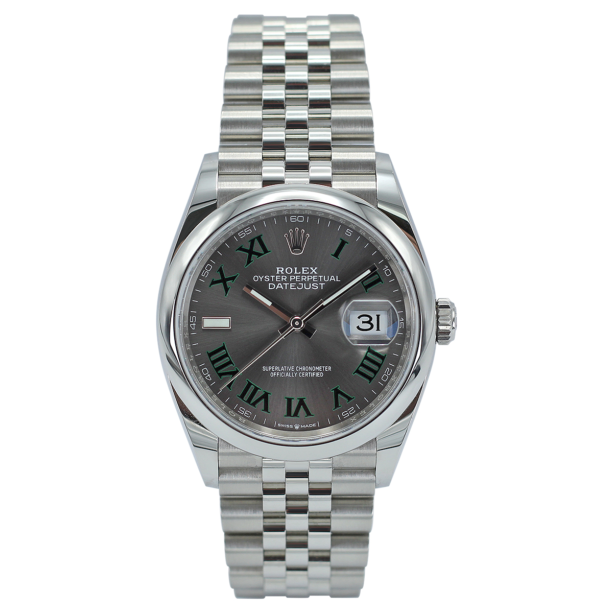 This Rolex Datejust 126200 has a slate roman numeral dial and a bracelet strap. This Rolex has undergone a thorough inspection of water resistance, accuracy, functionality and condition to determine the level of reconditioning required to meet our strict standards. It has also been referenced against technical documents and manufacturer records where available to ensure authenticity and a clean history. All our watches have a 24-month warranty for your peace of mind. One of our skilled polishing technicians has removed marks on the case and bracelet of this watch, brought about by daily wear and tear, which is why this watch does not come with the remaining manufacturer’s warranty.
