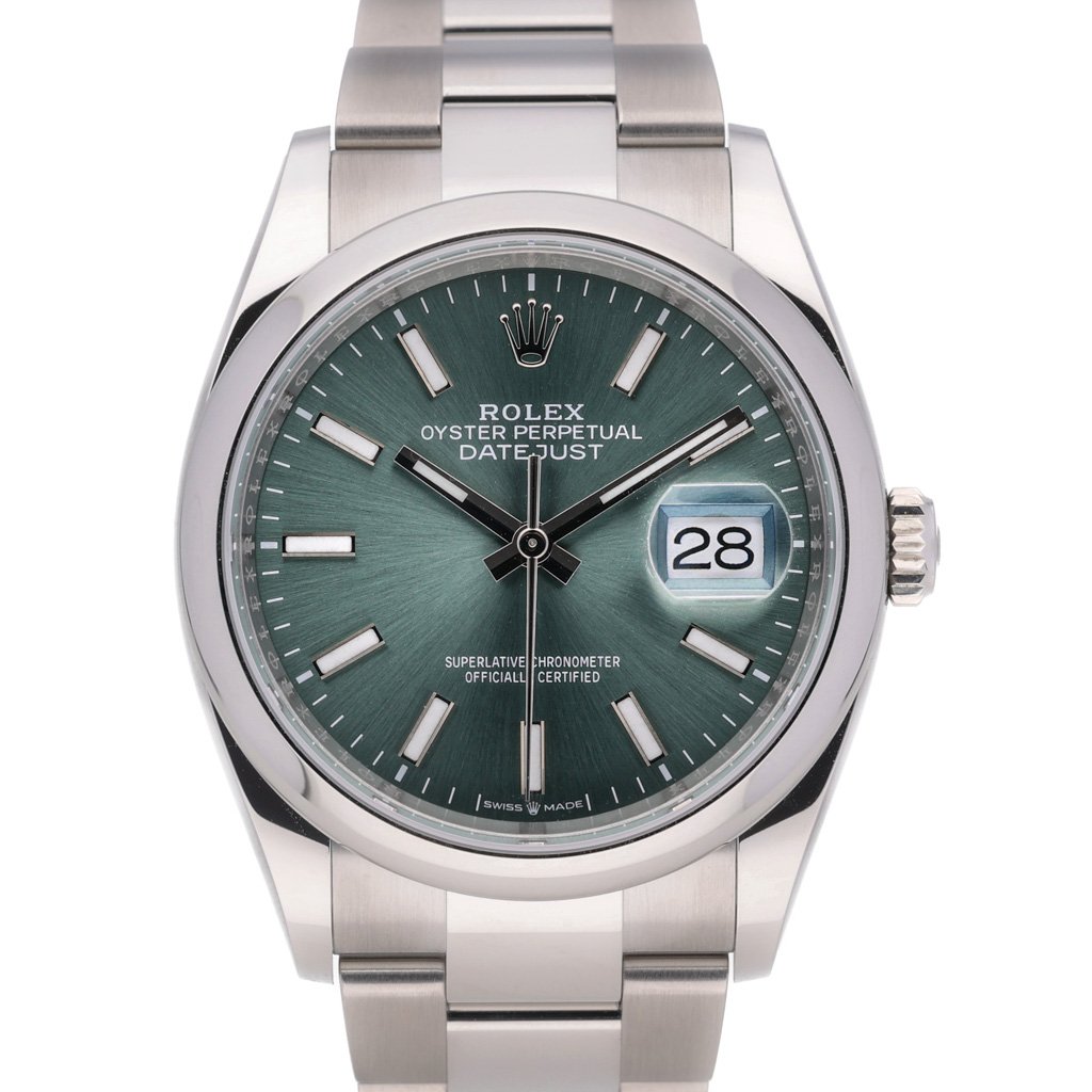 This Rolex Datejust 126200 has a mint green baton dial and a bracelet strap. This Rolex has undergone a thorough inspection of water resistance, accuracy, functionality and condition to determine the level of reconditioning required to meet our strict standards. It has also been referenced against technical documents and manufacturer records where available to ensure authenticity and a clean history. Our watches have a 24-month warranty for your peace of mind, in conjunction with any remaining manufacturer’s warranty from new or from service. To maintain the manufacturer’s warranty on this watch, it has not been polished in our service centre.