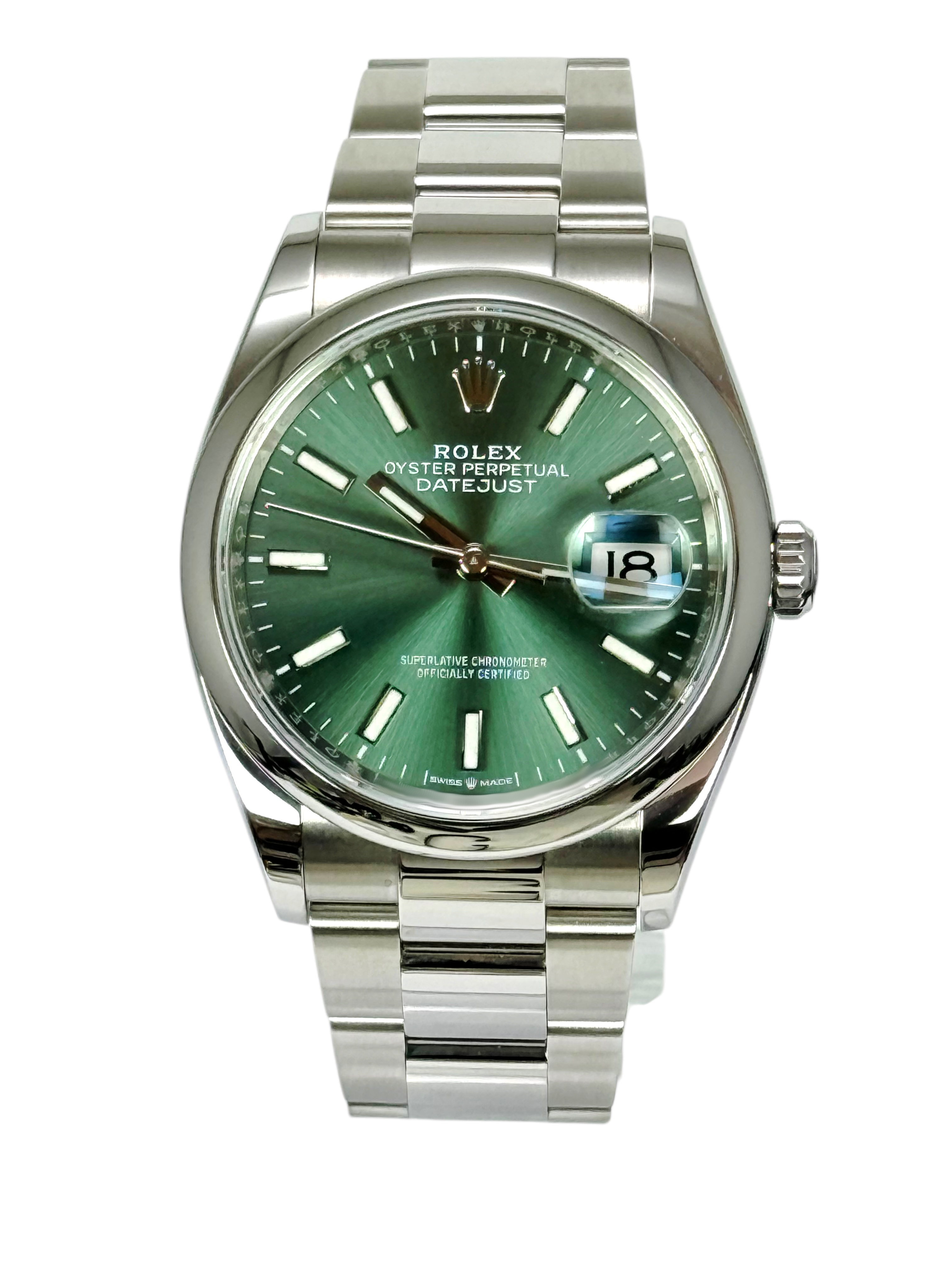This Rolex Datejust 126200 has a mint green baton dial and a bracelet strap. This Rolex has undergone a thorough inspection of water resistance, accuracy, functionality and condition to determine the level of reconditioning required to meet our strict standards. It has also been referenced against technical documents and manufacturer records where available to ensure authenticity and a clean history. Our watches have a 24-month warranty for your peace of mind, in conjunction with any remaining manufacturer’s warranty from new or from service. To maintain the manufacturer’s warranty on this watch, it has not been polished in our service centre.