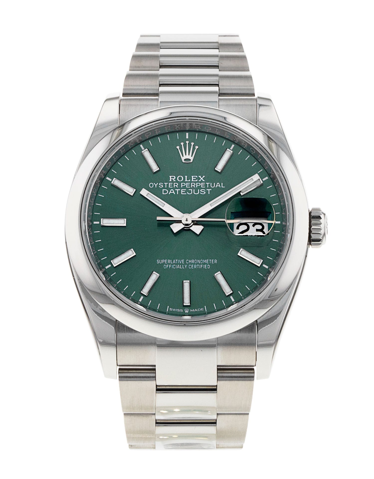 This Rolex Datejust 126200 has a mint green baton dial and a bracelet strap. This Rolex has undergone a thorough inspection of water resistance, accuracy, functionality and condition to determine the level of reconditioning required to meet our strict standards. It has also been referenced against technical documents and manufacturer records where available to ensure authenticity and a clean history. All our watches have a 24-month warranty for your peace of mind. One of our skilled polishing technicians has removed marks on the case and bracelet of this watch, brought about by daily wear and tear, which is why this watch does not come with the remaining manufacturer’s warranty.