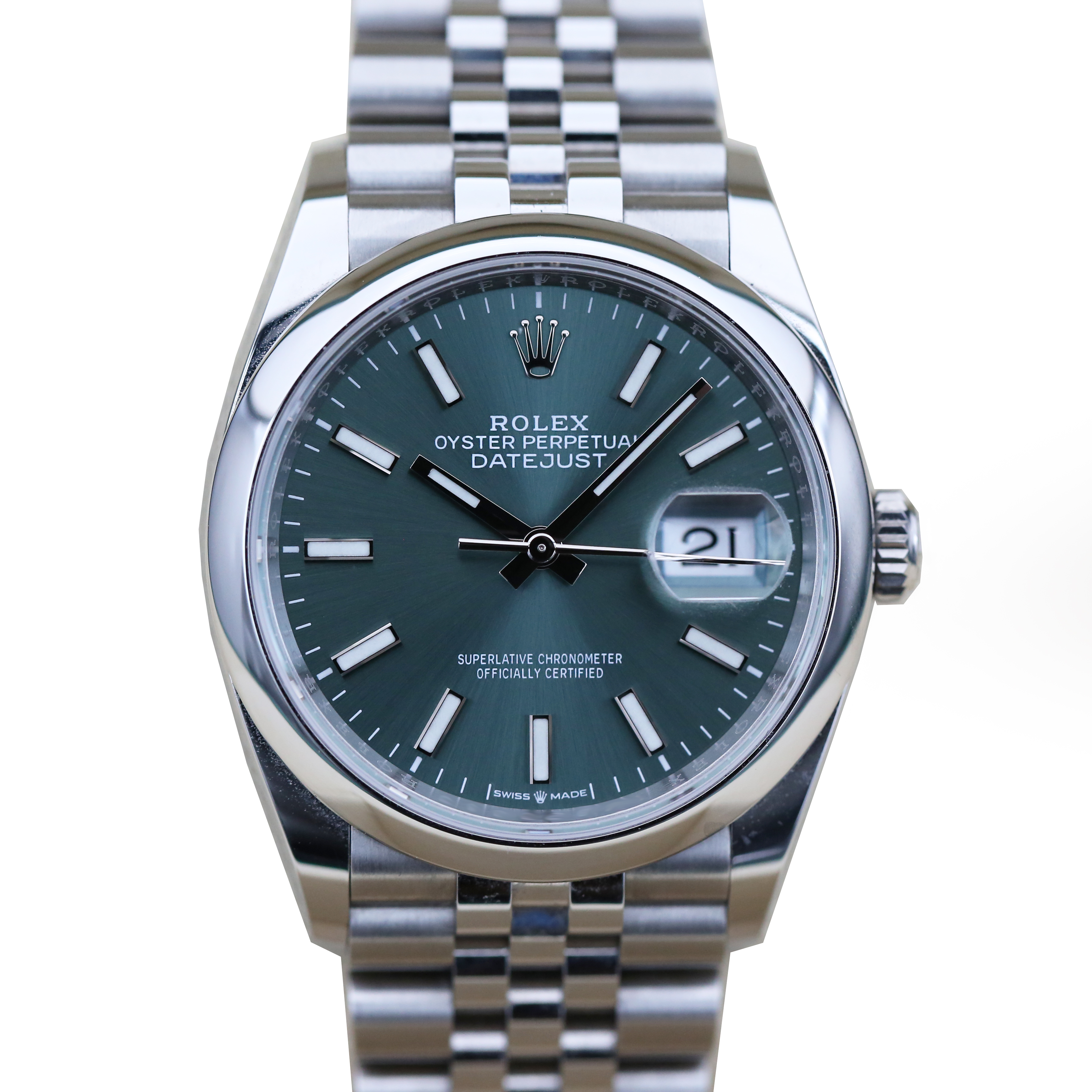 This Rolex Datejust 126200 has a mint green baton dial and a bracelet strap. This Rolex has undergone a thorough inspection of water resistance, accuracy, functionality and condition to determine the level of reconditioning required to meet our strict standards. It has also been referenced against technical documents and manufacturer records where available to ensure authenticity and a clean history. Our watches have a 24-month warranty for your peace of mind, in conjunction with any remaining manufacturer’s warranty from new or from service. To maintain the manufacturer’s warranty on this watch, it has not been polished in our service centre.