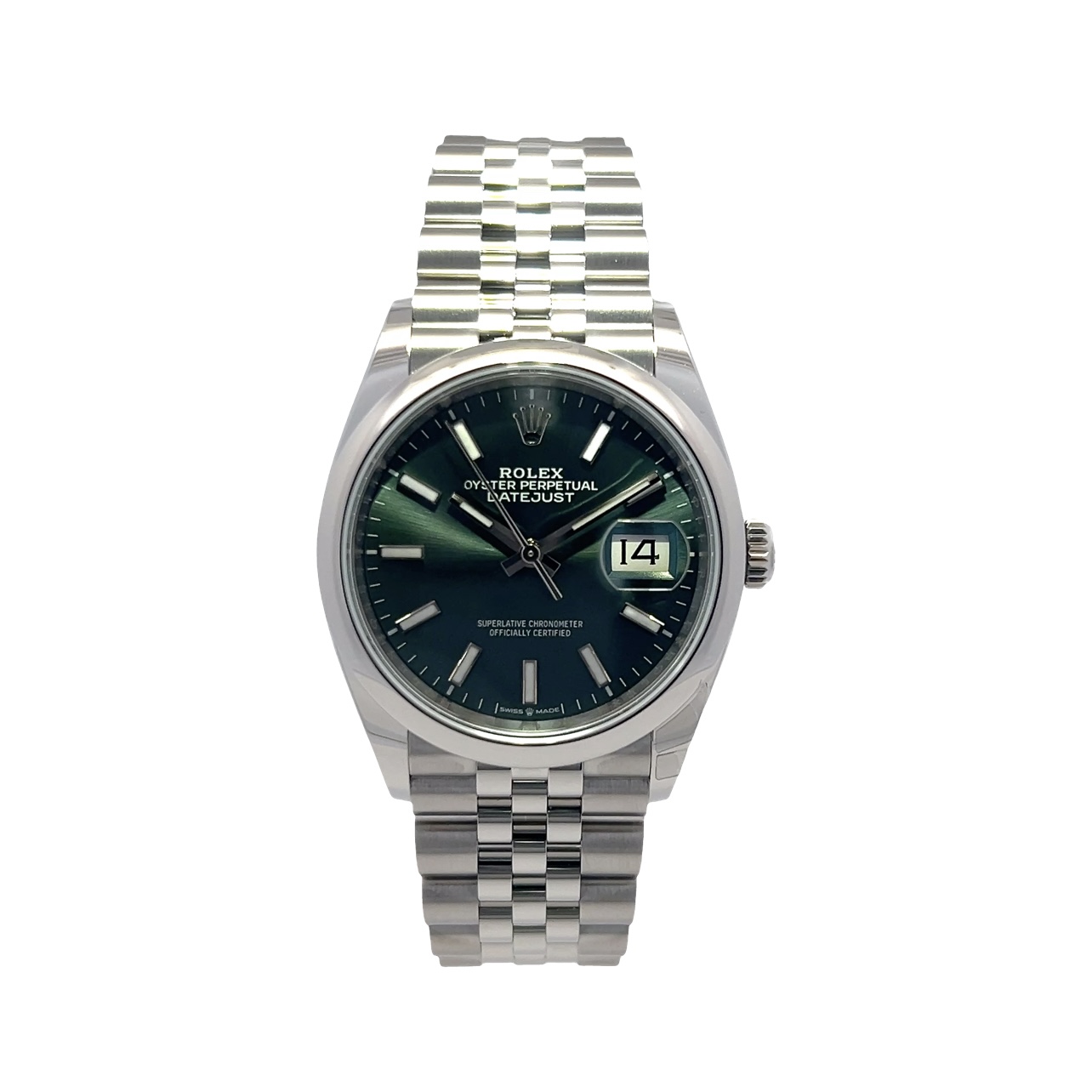 This Rolex Datejust 126200 has a mint green baton dial and a bracelet strap. This Rolex has undergone a thorough inspection of water resistance, accuracy, functionality and condition to determine the level of reconditioning required to meet our strict standards. It has also been referenced against technical documents and manufacturer records where available to ensure authenticity and a clean history. Our watches have a 24-month warranty for your peace of mind, in conjunction with any remaining manufacturer’s warranty from new or from service. To maintain the manufacturer’s warranty on this watch, it has not been polished in our service centre.
