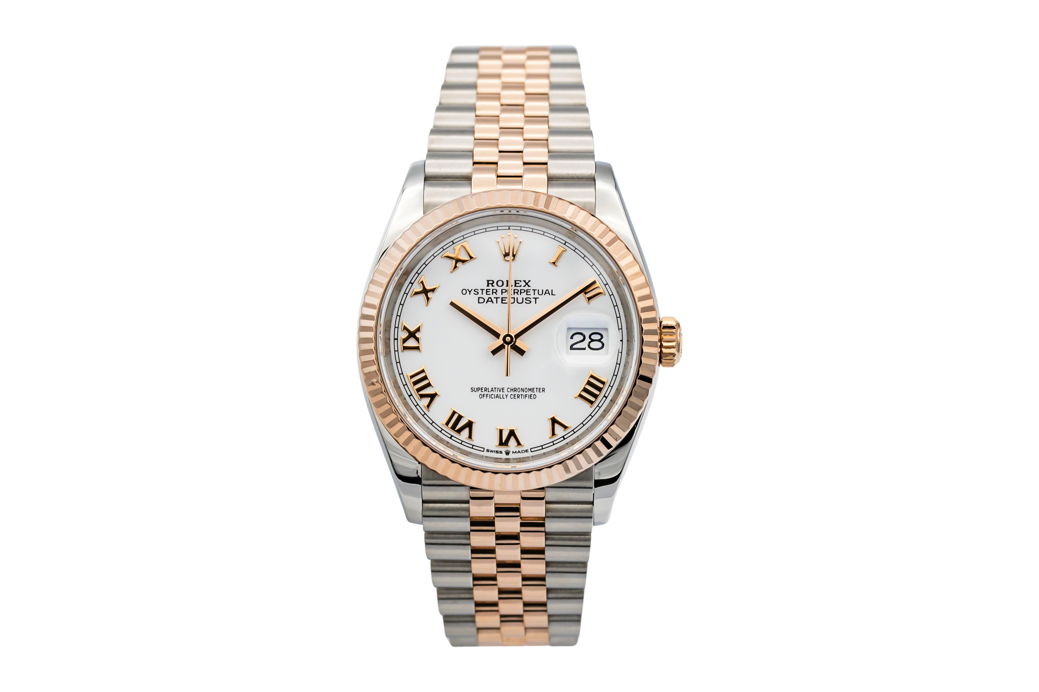 This Rolex Datejust 126231 has a white roman numeral dial and a bracelet strap. This Rolex has undergone a thorough inspection of water resistance, accuracy, functionality and condition to determine the level of reconditioning required to meet our strict standards. It has also been referenced against technical documents and manufacturer records where available to ensure authenticity and a clean history. Our watches have a 24-month warranty for your peace of mind, in conjunction with any remaining manufacturer’s warranty from new or from service. To maintain the manufacturer’s warranty on this watch, it has not been polished in our service centre.
