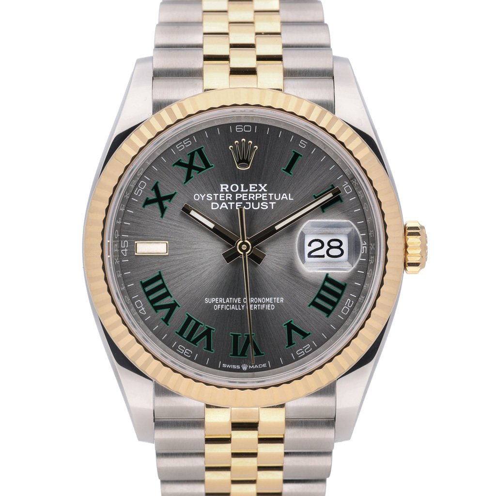 This Rolex Datejust 126233 has a slate roman numeral dial and a bracelet strap. This Rolex has undergone a thorough inspection of water resistance, accuracy, functionality and condition to determine the level of reconditioning required to meet our strict standards. It has also been referenced against technical documents and manufacturer records where available to ensure authenticity and a clean history. Our watches have a 24-month warranty for your peace of mind, in conjunction with any remaining manufacturer’s warranty from new or from service. To maintain the manufacturer’s warranty on this watch, it has not been polished in our service centre.
