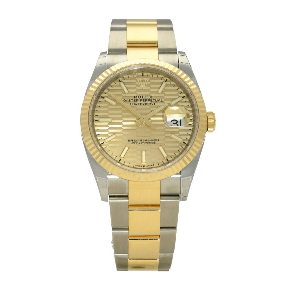 This Rolex Datejust 126233 has a golden fluted motif dial and a bracelet strap. This Rolex has undergone a thorough inspection of water resistance, accuracy, functionality and condition to determine the level of reconditioning required to meet our strict standards. It has also been referenced against technical documents and manufacturer records where available to ensure authenticity and a clean history. All our watches have a 24-month warranty for your peace of mind. One of our skilled polishing technicians has removed marks on the case and bracelet of this watch, brought about by daily wear and tear, which is why this watch does not come with the remaining manufacturer’s warranty.