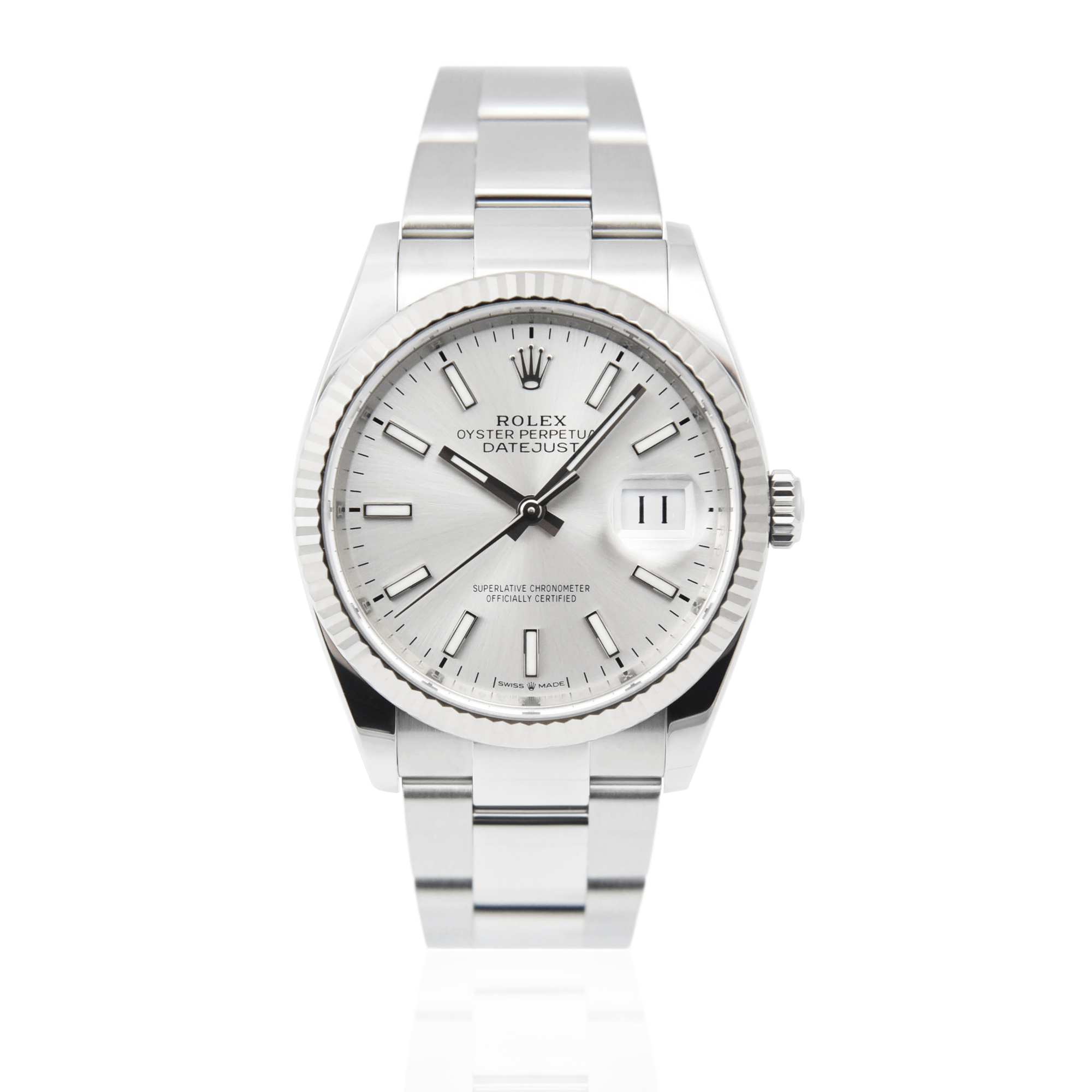 This Rolex Datejust 126234 has a silver baton dial and a bracelet strap. This Rolex has undergone a thorough inspection of water resistance, accuracy, functionality and condition to determine the level of reconditioning required to meet our strict standards. It has also been referenced against technical documents and manufacturer records where available to ensure authenticity and a clean history. Our watches have a 24-month warranty for your peace of mind, in conjunction with any remaining manufacturer’s warranty from new or from service. To maintain the manufacturer’s warranty on this watch, it has not been polished in our service centre.