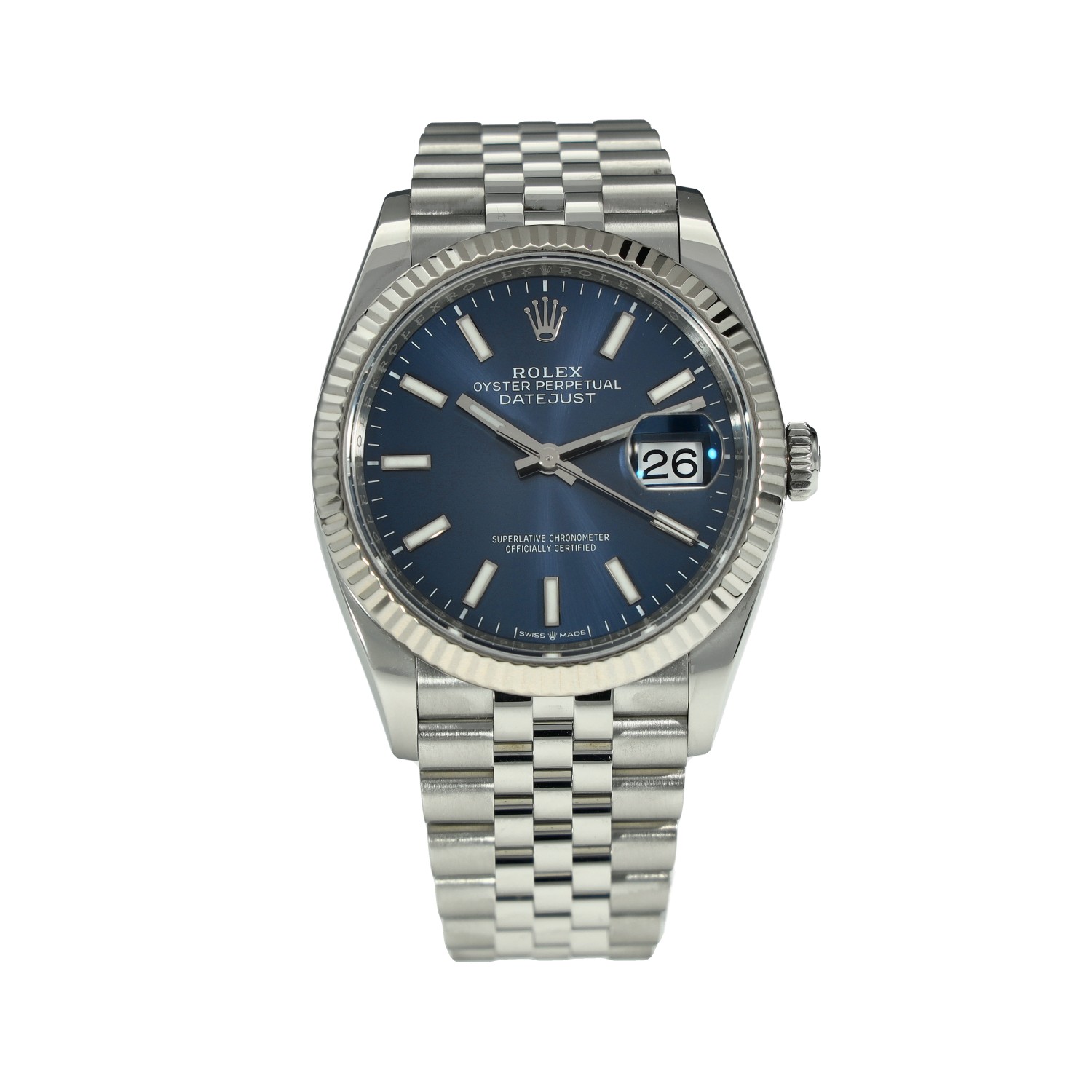 This Rolex Datejust 126234 has a blue baton dial and a bracelet strap. This Rolex has undergone a thorough inspection of water resistance, accuracy, functionality and condition to determine the level of reconditioning required to meet our strict standards. It has also been referenced against technical documents and manufacturer records where available to ensure authenticity and a clean history. Our watches have a 24-month warranty for your peace of mind, in conjunction with any remaining manufacturer’s warranty from new or from service. To maintain the manufacturer’s warranty on this watch, it has not been polished in our service centre.