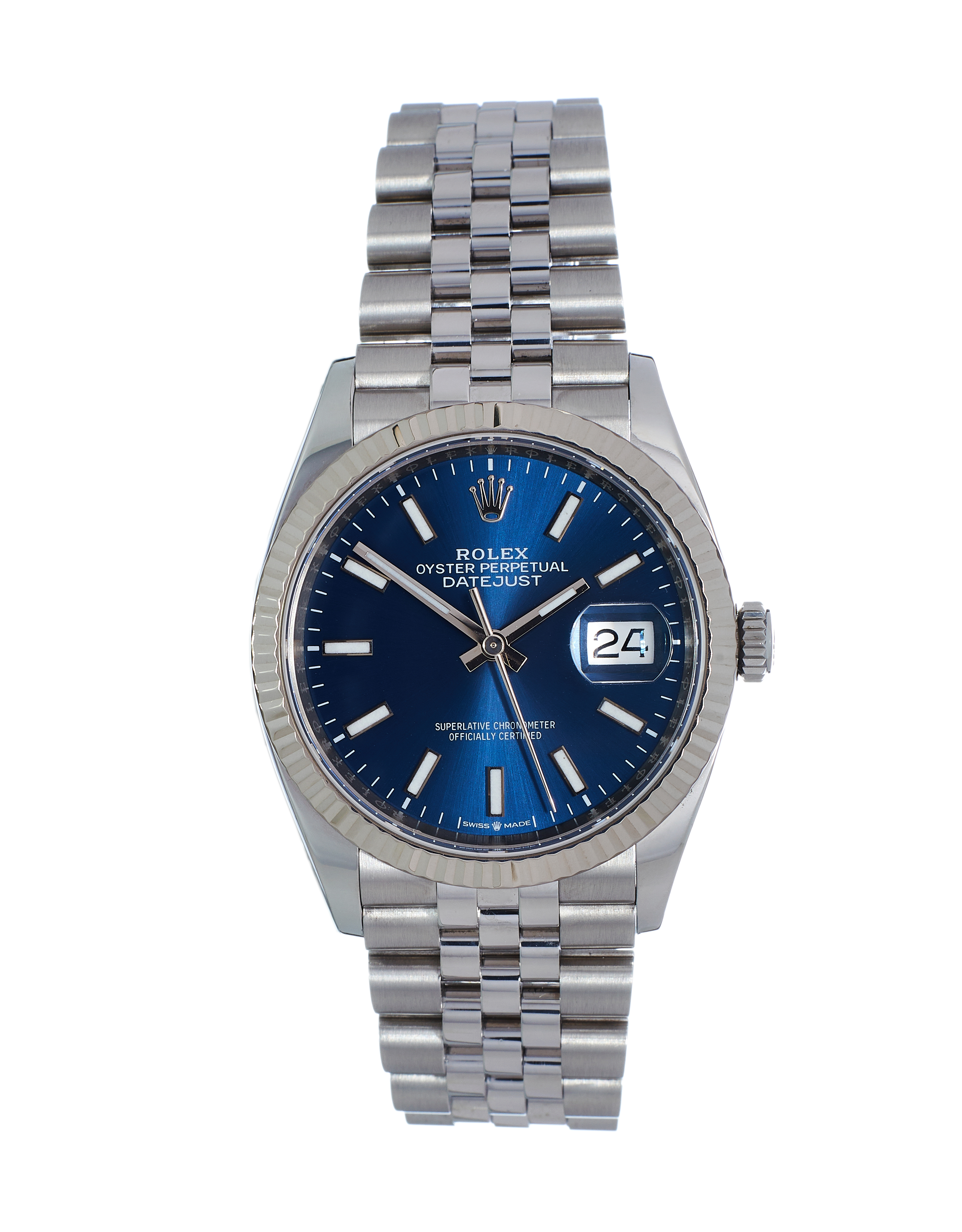 This Rolex Datejust 126234 has a blue baton dial and a bracelet strap. This Rolex has undergone a thorough inspection of water resistance, accuracy, functionality and condition to determine the level of reconditioning required to meet our strict standards. It has also been referenced against technical documents and manufacturer records where available to ensure authenticity and a clean history. All our watches have a 24-month warranty for your peace of mind. One of our skilled polishing technicians has removed marks on the case and bracelet of this watch, brought about by daily wear and tear, which is why this watch does not come with the remaining manufacturer’s warranty.