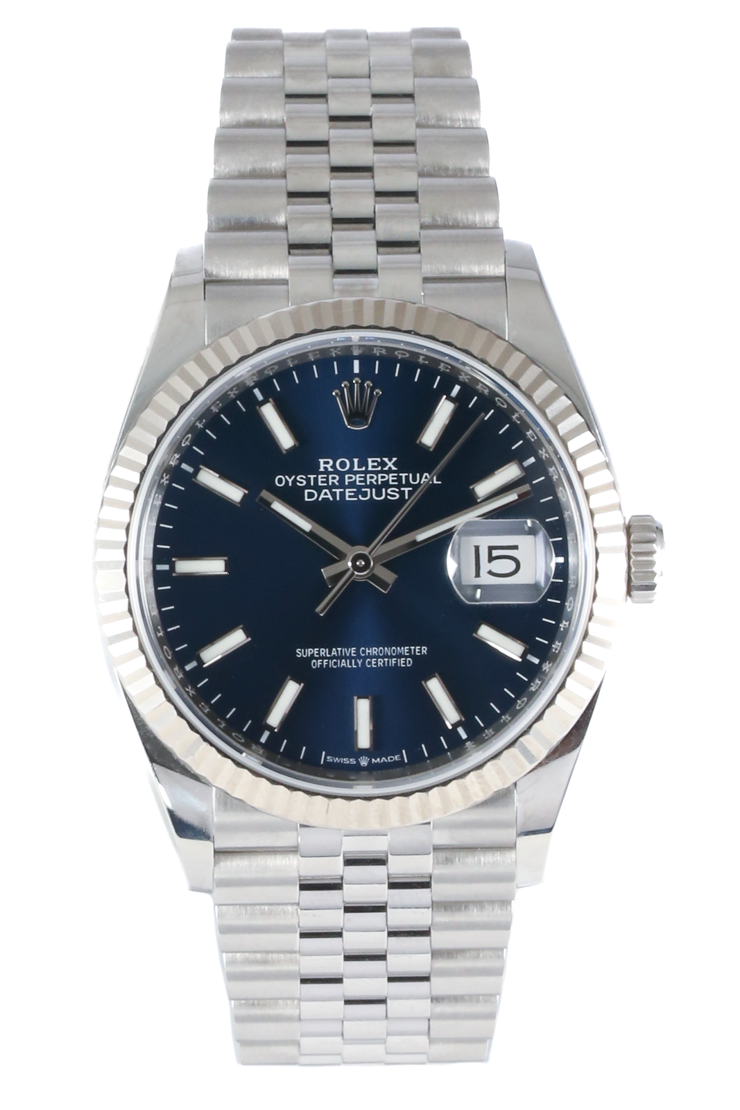 This Rolex Datejust 126234 has a blue baton dial and a bracelet strap. This Rolex has undergone a thorough inspection of water resistance, accuracy, functionality and condition to determine the level of reconditioning required to meet our strict standards. It has also been referenced against technical documents and manufacturer records where available to ensure authenticity and a clean history. All our watches have a 24-month warranty for your peace of mind. One of our skilled polishing technicians has removed marks on the case and bracelet of this watch, brought about by daily wear and tear, which is why this watch does not come with the remaining manufacturer’s warranty.