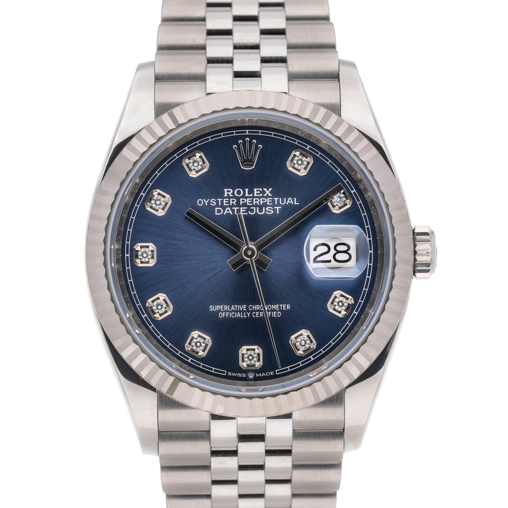 This Rolex Datejust 126234 has a blue diamond dial and a bracelet strap. This Rolex has undergone a thorough inspection of water resistance, accuracy, functionality and condition to determine the level of reconditioning required to meet our strict standards. It has also been referenced against technical documents and manufacturer records where available to ensure authenticity and a clean history. All our watches have a 24-month warranty for your peace of mind. One of our skilled polishing technicians has removed marks on the case and bracelet of this watch, brought about by daily wear and tear, which is why this watch does not come with the remaining manufacturer’s warranty.