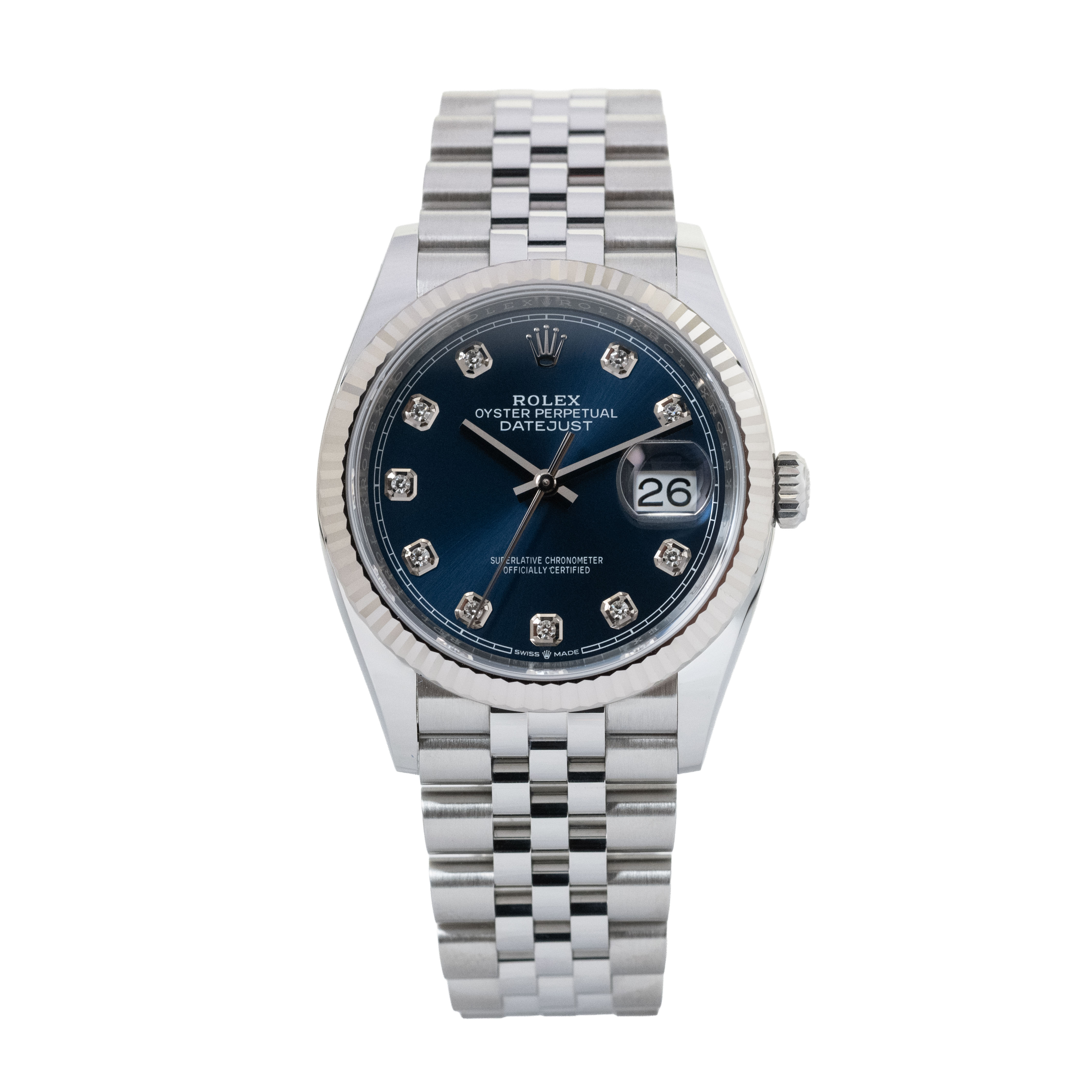 This Rolex Datejust 126234 has a blue diamond dial and a bracelet strap. This Rolex has undergone a thorough inspection of water resistance, accuracy, functionality and condition to determine the level of reconditioning required to meet our strict standards. It has also been referenced against technical documents and manufacturer records where available to ensure authenticity and a clean history. Our watches have a 24-month warranty for your peace of mind, in conjunction with any remaining manufacturer’s warranty from new or from service. To maintain the manufacturer’s warranty on this watch, it has not been polished in our service centre.