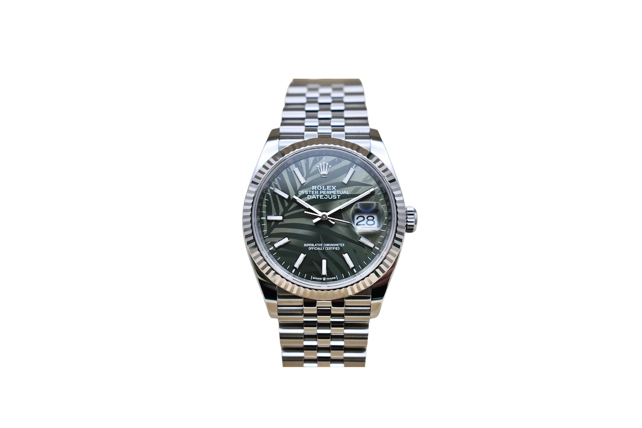 This Rolex Datejust 126234 has a olive green palm motif dial and a bracelet strap. This Rolex has undergone a thorough inspection of water resistance, accuracy, functionality and condition to determine the level of reconditioning required to meet our strict standards. It has also been referenced against technical documents and manufacturer records where available to ensure authenticity and a clean history. Our watches have a 24-month warranty for your peace of mind, in conjunction with any remaining manufacturer’s warranty from new or from service. To maintain the manufacturer’s warranty on this watch, it has not been polished in our service centre.