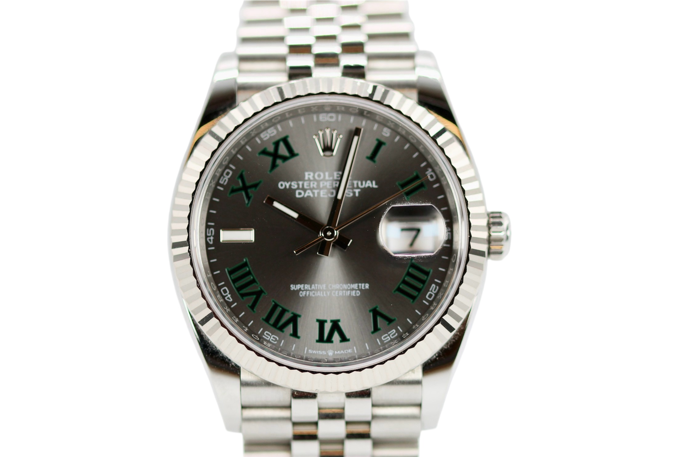 This Rolex Datejust 126234 has a slate roman numeral dial and a bracelet strap. This Rolex has undergone a thorough inspection of water resistance, accuracy, functionality and condition to determine the level of reconditioning required to meet our strict standards. It has also been referenced against technical documents and manufacturer records where available to ensure authenticity and a clean history. Our watches have a 24-month warranty for your peace of mind, in conjunction with any remaining manufacturer’s warranty from new or from service. To maintain the manufacturer’s warranty on this watch, it has not been polished in our service centre.