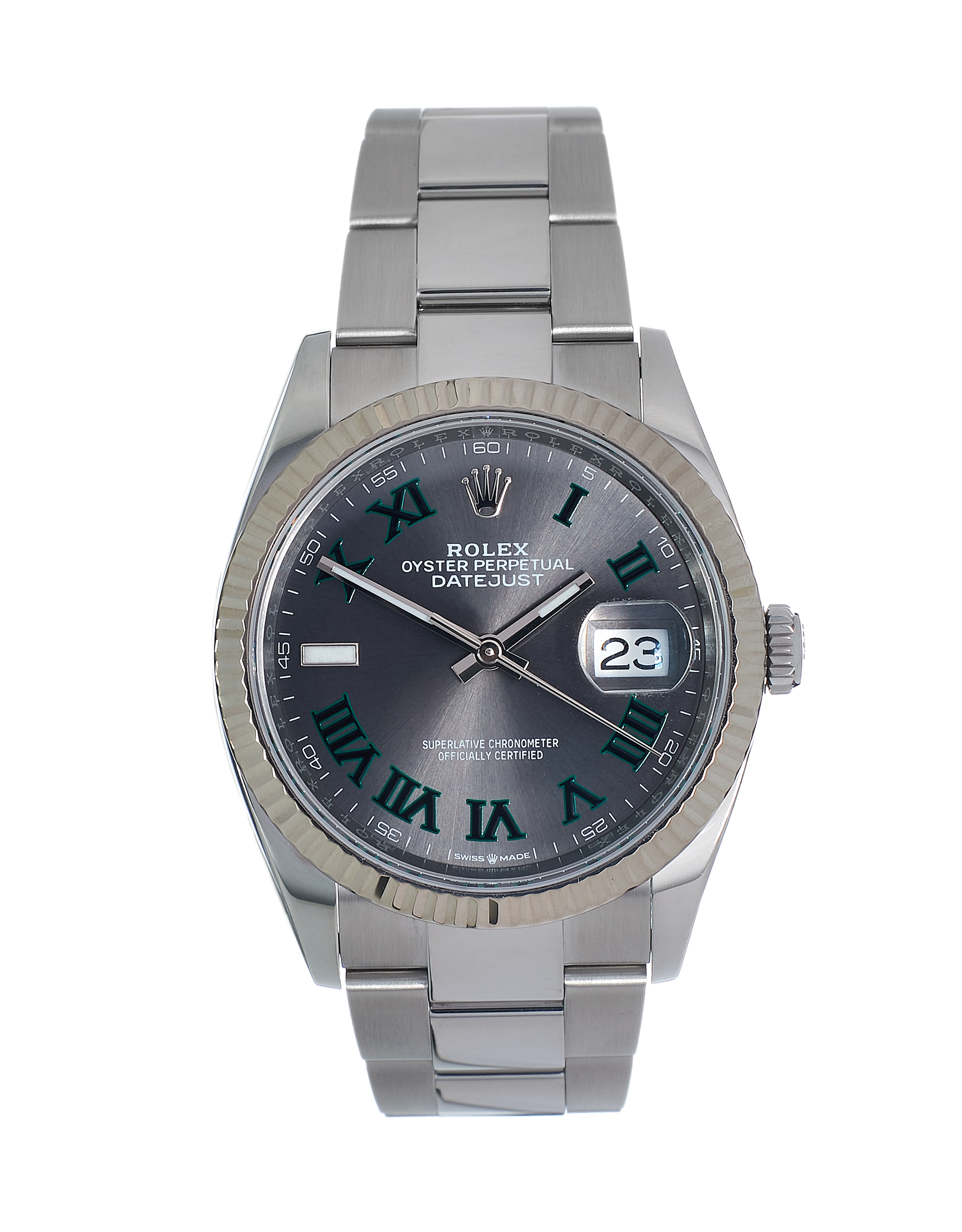 This Rolex Datejust 126234 has a slate roman numeral dial and a bracelet strap. This Rolex has undergone a thorough inspection of water resistance, accuracy, functionality and condition to determine the level of reconditioning required to meet our strict standards. It has also been referenced against technical documents and manufacturer records where available to ensure authenticity and a clean history. All our watches have a 24-month warranty for your peace of mind. One of our skilled polishing technicians has removed marks on the case and bracelet of this watch, brought about by daily wear and tear, which is why this watch does not come with the remaining manufacturer’s warranty.