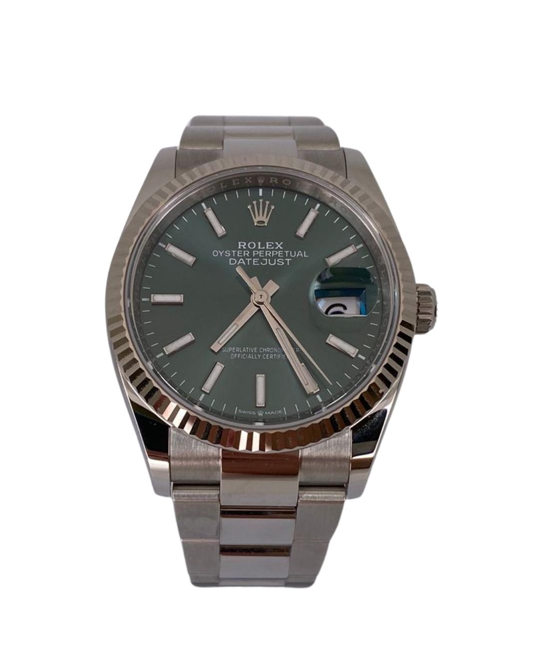 This Rolex Datejust 126234 has a mint green baton dial and a bracelet strap. This Rolex has undergone a thorough inspection of water resistance, accuracy, functionality and condition to determine the level of reconditioning required to meet our strict standards. It has also been referenced against technical documents and manufacturer records where available to ensure authenticity and a clean history. Our watches have a 24-month warranty for your peace of mind, in conjunction with any remaining manufacturer’s warranty from new or from service. To maintain the manufacturer’s warranty on this watch, it has not been polished in our service centre.