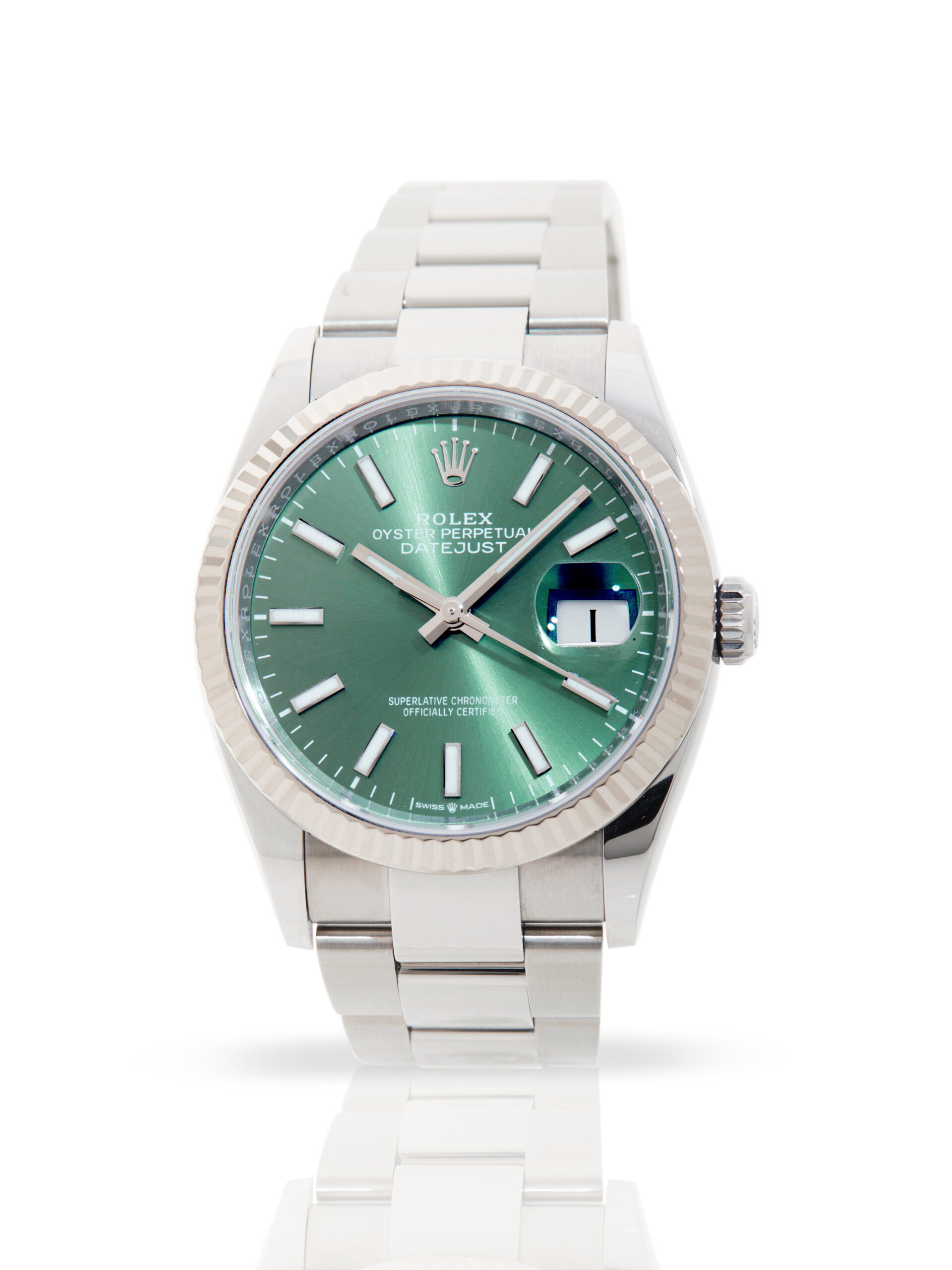 This Rolex Datejust 126234 has a mint green baton dial and a bracelet strap. This Rolex has undergone a thorough inspection of water resistance, accuracy, functionality and condition to determine the level of reconditioning required to meet our strict standards. It has also been referenced against technical documents and manufacturer records where available to ensure authenticity and a clean history. Our watches have a 24-month warranty for your peace of mind, in conjunction with any remaining manufacturer’s warranty from new or from service. To maintain the manufacturer’s warranty on this watch, it has not been polished in our service centre.