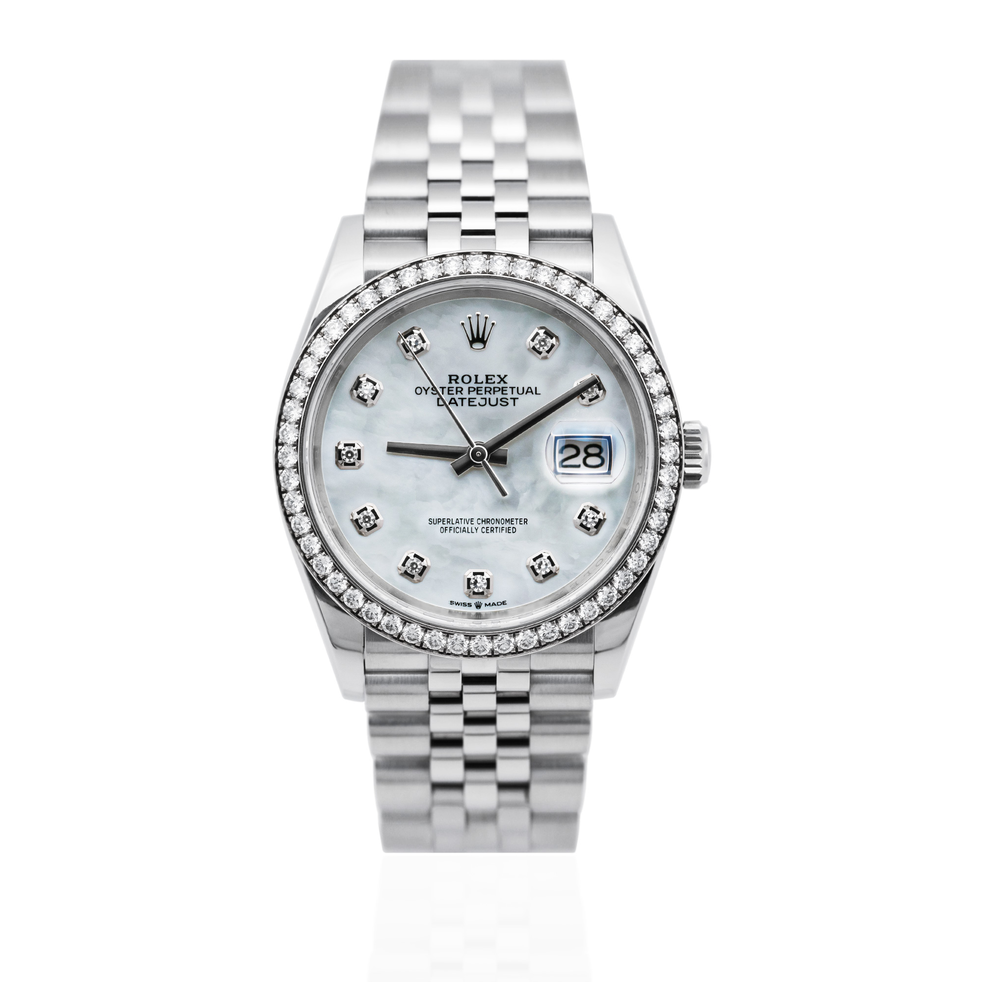 This Rolex Datejust 126284 RBR has a mother of pearl white - diamond dial and a bracelet strap. This Rolex has undergone a thorough inspection of water resistance, accuracy, functionality and condition to determine the level of reconditioning required to meet our strict standards. It has also been referenced against technical documents and manufacturer records where available to ensure authenticity and a clean history. Our watches have a 24-month warranty for your peace of mind, in conjunction with any remaining manufacturer’s warranty from new or from service. To maintain the manufacturer’s warranty on this watch, it has not been polished in our service centre.