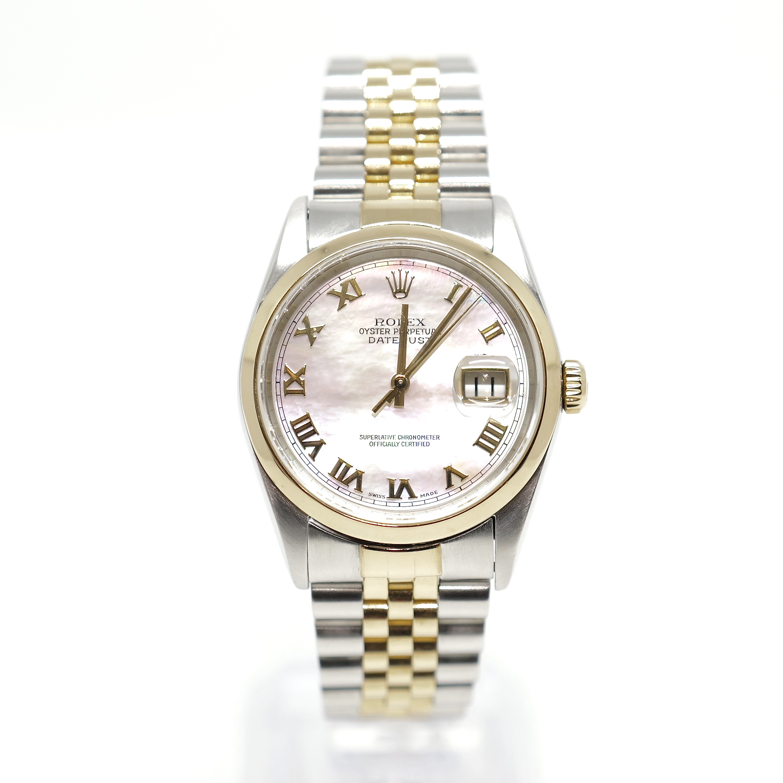 This Rolex Datejust 16203 has a white arabic dial and a bracelet strap. This Rolex has undergone a thorough inspection of water resistance, accuracy, functionality and condition to determine the level of reconditioning required to meet our strict standards. It has also been referenced against technical documents and manufacturer records where available to ensure authenticity and a clean history. All our watches have a 24-month warranty for your peace of mind. One of our skilled polishing technicians has removed marks on the case and bracelet of this watch, brought about by daily wear and tear, which is why this watch does not come with the remaining manufacturer’s warranty.