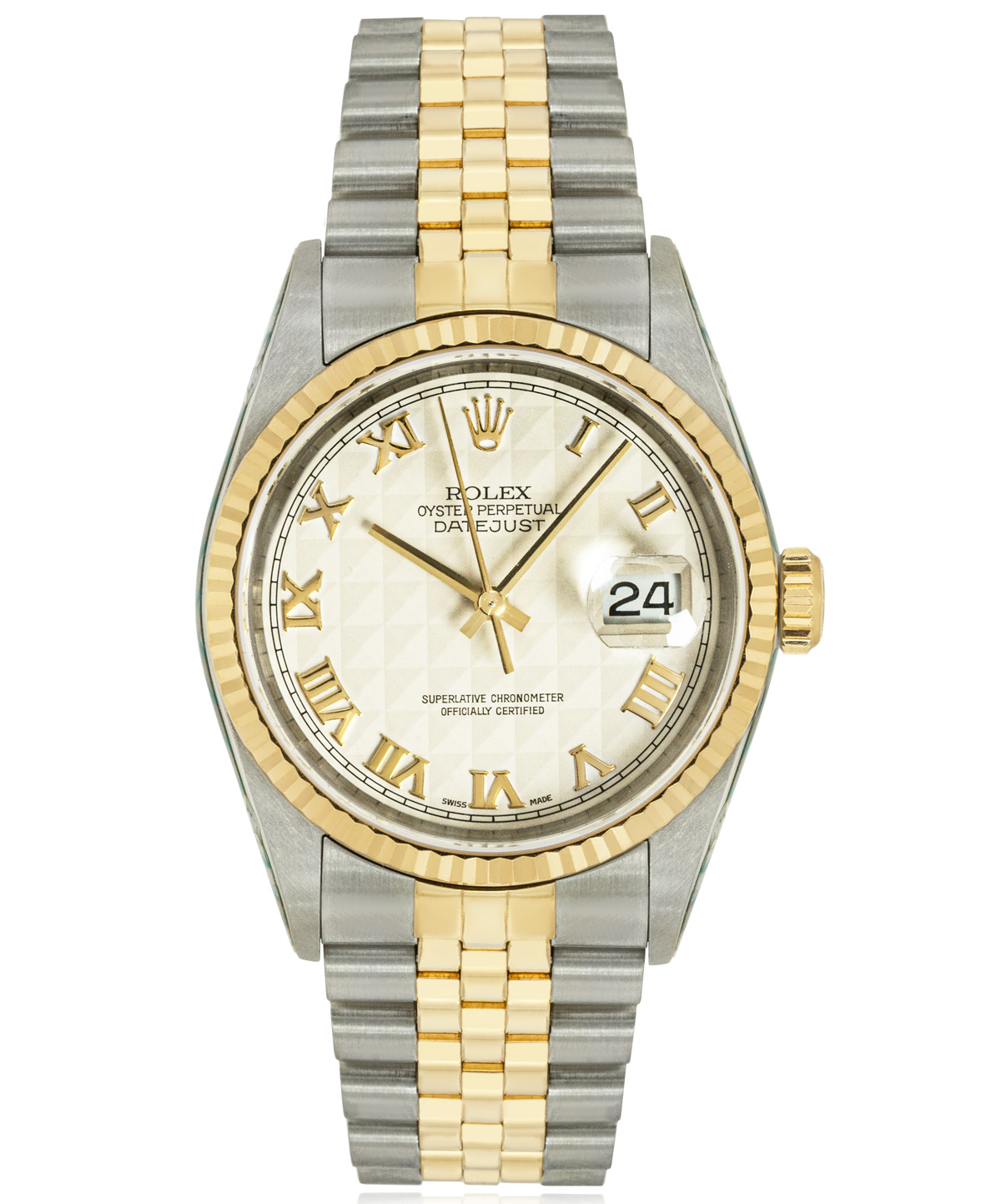 This Rolex Datejust 16233 has a ivory pyramid roman numeral dial and a bracelet strap. This Rolex has undergone a thorough inspection of water resistance, accuracy, functionality and condition to determine the level of reconditioning required to meet our strict standards. It has also been referenced against technical documents and manufacturer records where available to ensure authenticity and a clean history. All our watches have a 24-month warranty for your peace of mind. One of our skilled polishing technicians has removed marks on the case and bracelet of this watch, brought about by daily wear and tear, which is why this watch does not come with the remaining manufacturer’s warranty.