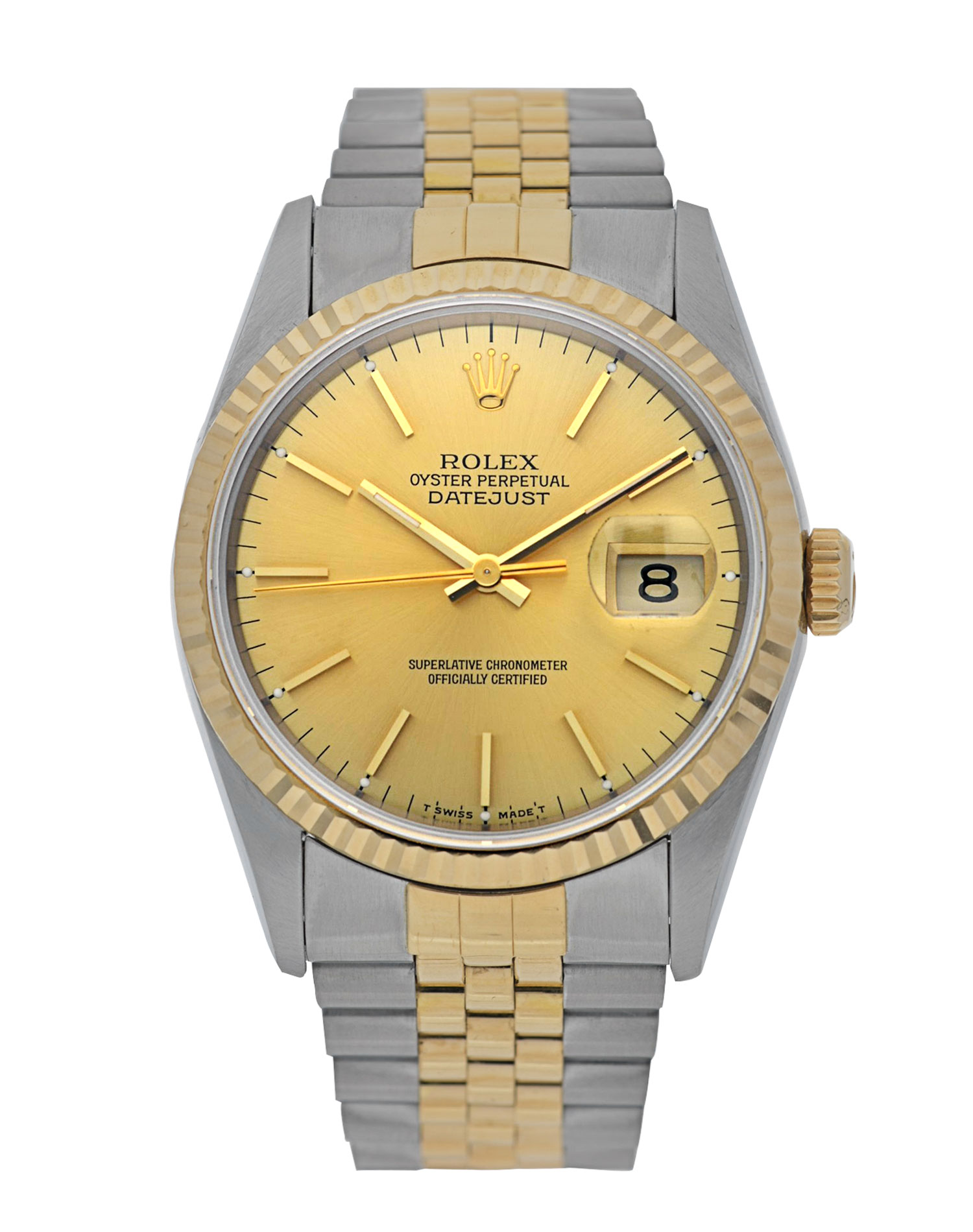 This Rolex Datejust 16233 has a champagne baton dial and a bracelet strap. This Rolex has undergone a thorough inspection of water resistance, accuracy, functionality and condition to determine the level of reconditioning required to meet our strict standards. It has also been referenced against technical documents and manufacturer records where available to ensure authenticity and a clean history. All our watches have a 24-month warranty for your peace of mind. One of our skilled polishing technicians has removed marks on the case and bracelet of this watch, brought about by daily wear and tear, which is why this watch does not come with the remaining manufacturer’s warranty.