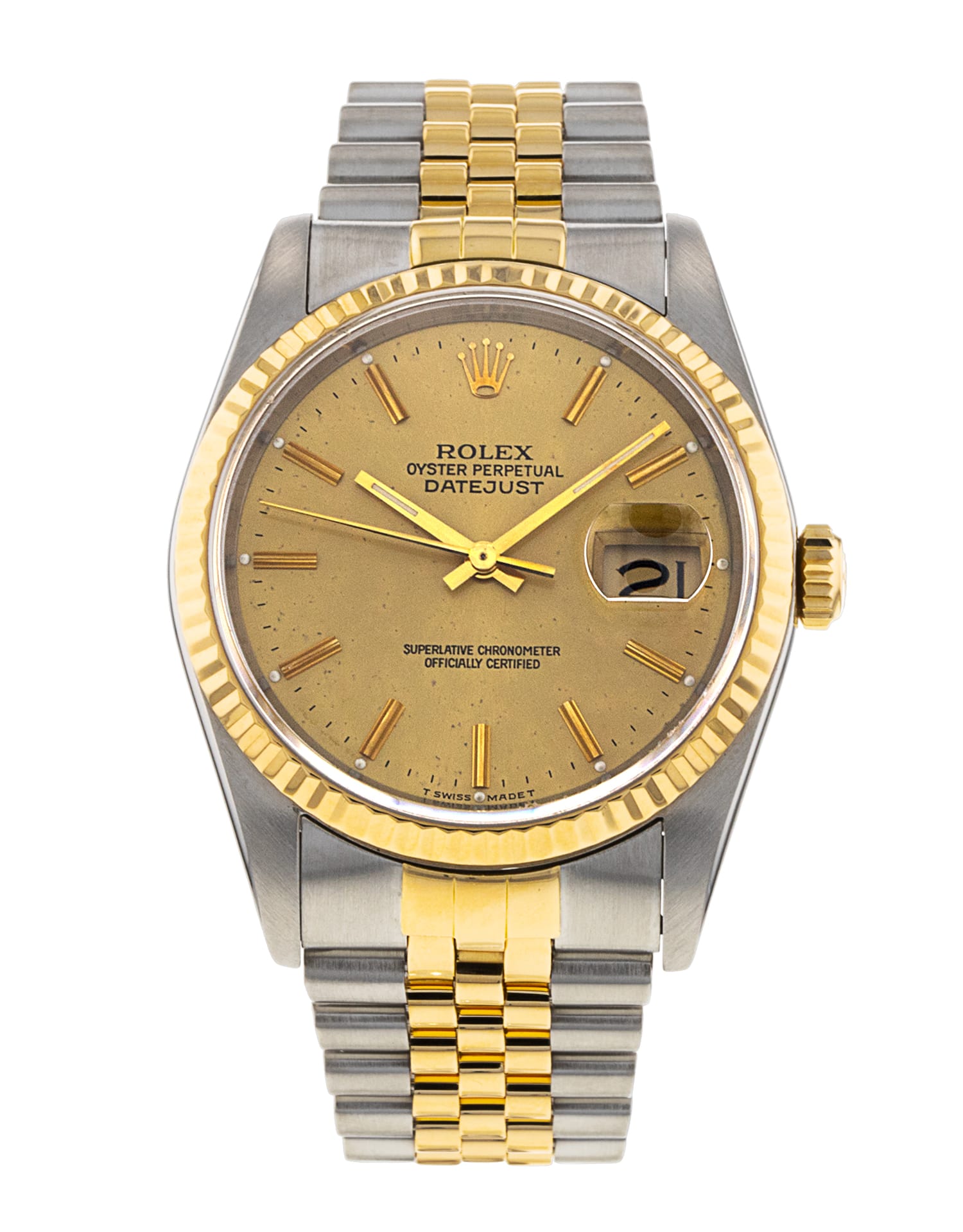 This Rolex Datejust 16233 has a champagne baton with roman numerals dial and a bracelet strap. This Rolex has undergone a thorough inspection of accuracy, functionality and condition to determine the level of reconditioning required to meet our strict standards. It has also been referenced against technical documents and manufacturer records where available to ensure authenticity and a clean history. All our watches have a 24-month warranty for your peace of mind. One of our skilled polishing technicians has removed marks on the case and bracelet of this watch, brought about by daily wear and tear, which is why this watch does not come with the remaining manufacturer’s warranty.