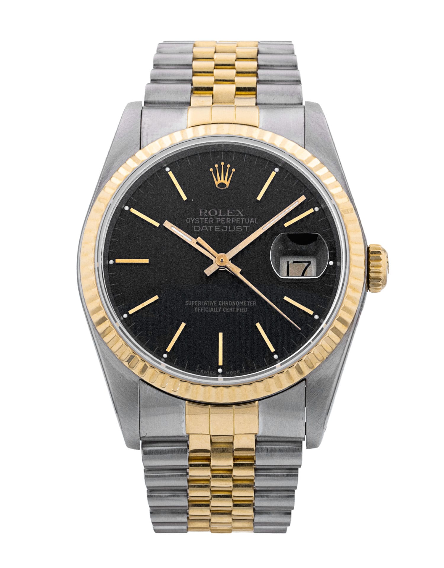 This Rolex Datejust 16233 has a black tapestry baton dial and a bracelet strap. This Rolex has undergone a thorough inspection of water resistance, accuracy, functionality and condition to determine the level of reconditioning required to meet our strict standards. It has also been referenced against technical documents and manufacturer records where available to ensure authenticity and a clean history. All our watches have a 24-month warranty for your peace of mind. One of our skilled polishing technicians has removed marks on the case and bracelet of this watch, brought about by daily wear and tear, which is why this watch does not come with the remaining manufacturer’s warranty.