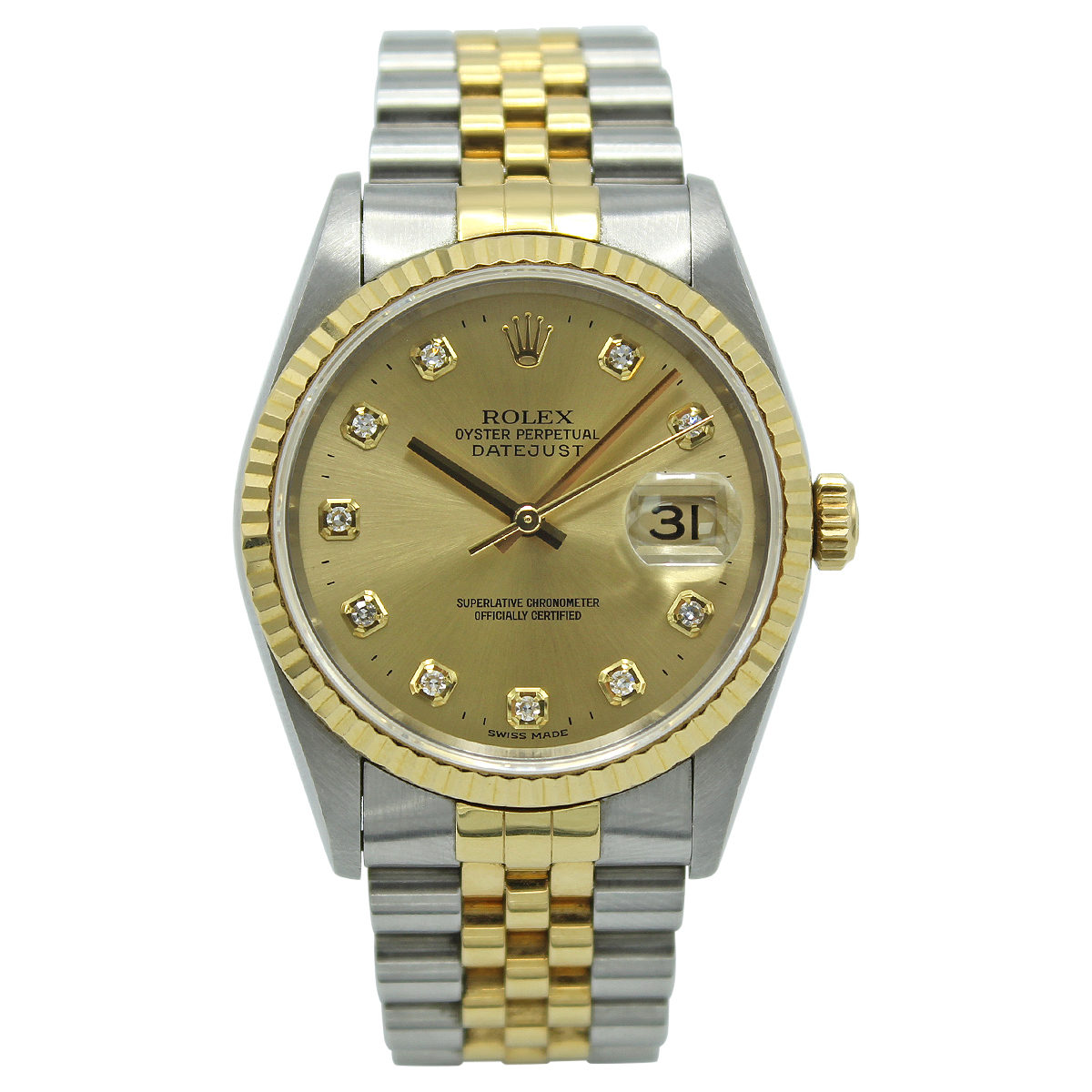 This Rolex Datejust 16233 has a champagne diamond dial and a bracelet strap. This Rolex has undergone a thorough inspection of water resistance, accuracy, functionality and condition to determine the level of reconditioning required to meet our strict standards. It has also been referenced against technical documents and manufacturer records where available to ensure authenticity and a clean history. All our watches have a 24-month warranty for your peace of mind. One of our skilled polishing technicians has removed marks on the case and bracelet of this watch, brought about by daily wear and tear, which is why this watch does not come with the remaining manufacturer’s warranty.
