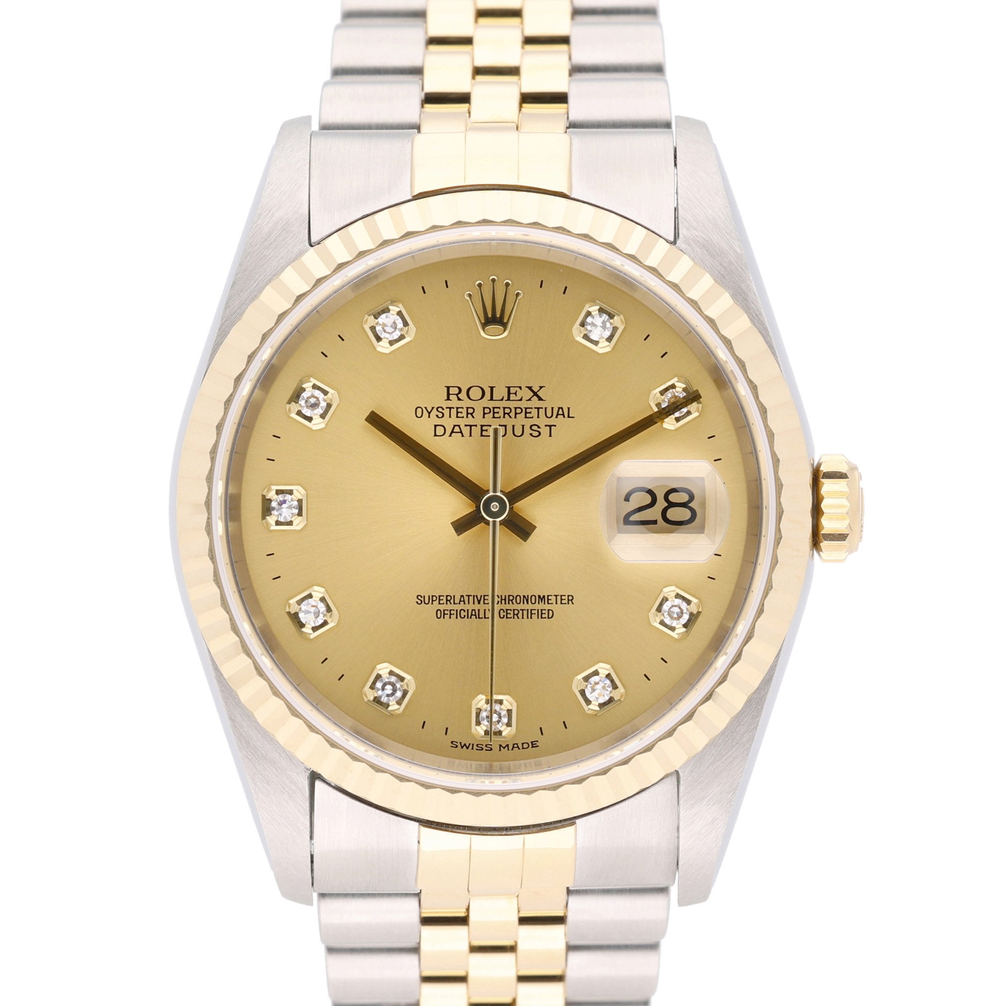 This Rolex Datejust 16233 has a champagne diamond dial and a bracelet strap. This Rolex has undergone a thorough inspection of water resistance, accuracy, functionality and condition to determine the level of reconditioning required to meet our strict standards. It has also been referenced against technical documents and manufacturer records where available to ensure authenticity and a clean history. All our watches have a 24-month warranty for your peace of mind. One of our skilled polishing technicians has removed marks on the case and bracelet of this watch, brought about by daily wear and tear, which is why this watch does not come with the remaining manufacturer’s warranty.