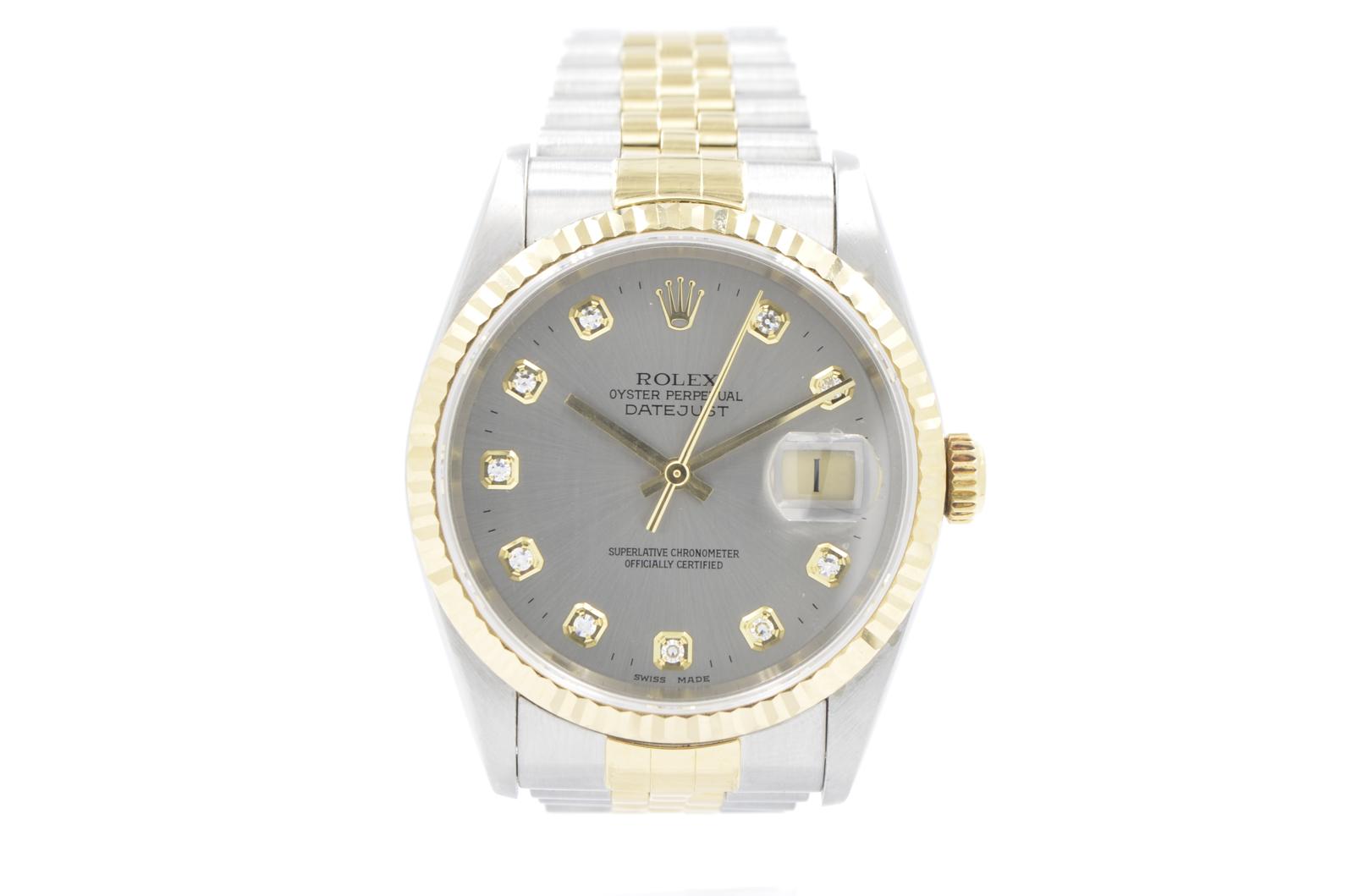 This Rolex Datejust 16233 has a grey diamond dial and a bracelet strap. This Rolex has undergone a thorough inspection of water resistance, accuracy, functionality and condition to determine the level of reconditioning required to meet our strict standards. It has also been referenced against technical documents and manufacturer records where available to ensure authenticity and a clean history. All our watches have a 24-month warranty for your peace of mind. One of our skilled polishing technicians has removed marks on the case and bracelet of this watch, brought about by daily wear and tear, which is why this watch does not come with the remaining manufacturer’s warranty.