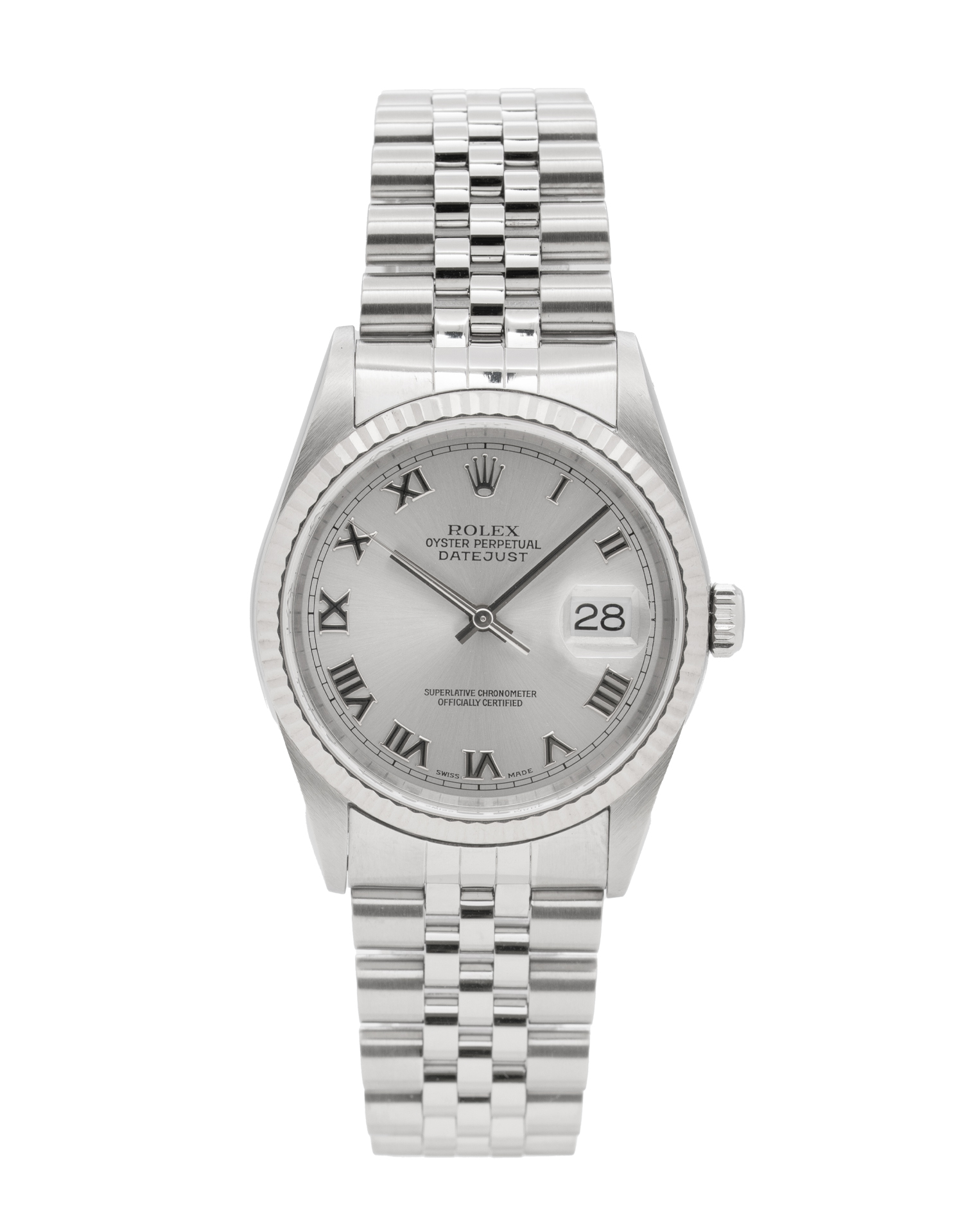 This Rolex Datejust 16234 has a silver roman numeral dial and a bracelet strap. This Rolex has undergone a thorough inspection of water resistance, accuracy, functionality and condition to determine the level of reconditioning required to meet our strict standards. It has also been referenced against technical documents and manufacturer records where available to ensure authenticity and a clean history. All our watches have a 24-month warranty for your peace of mind. One of our skilled polishing technicians has removed marks on the case and bracelet of this watch, brought about by daily wear and tear, which is why this watch does not come with the remaining manufacturer’s warranty.