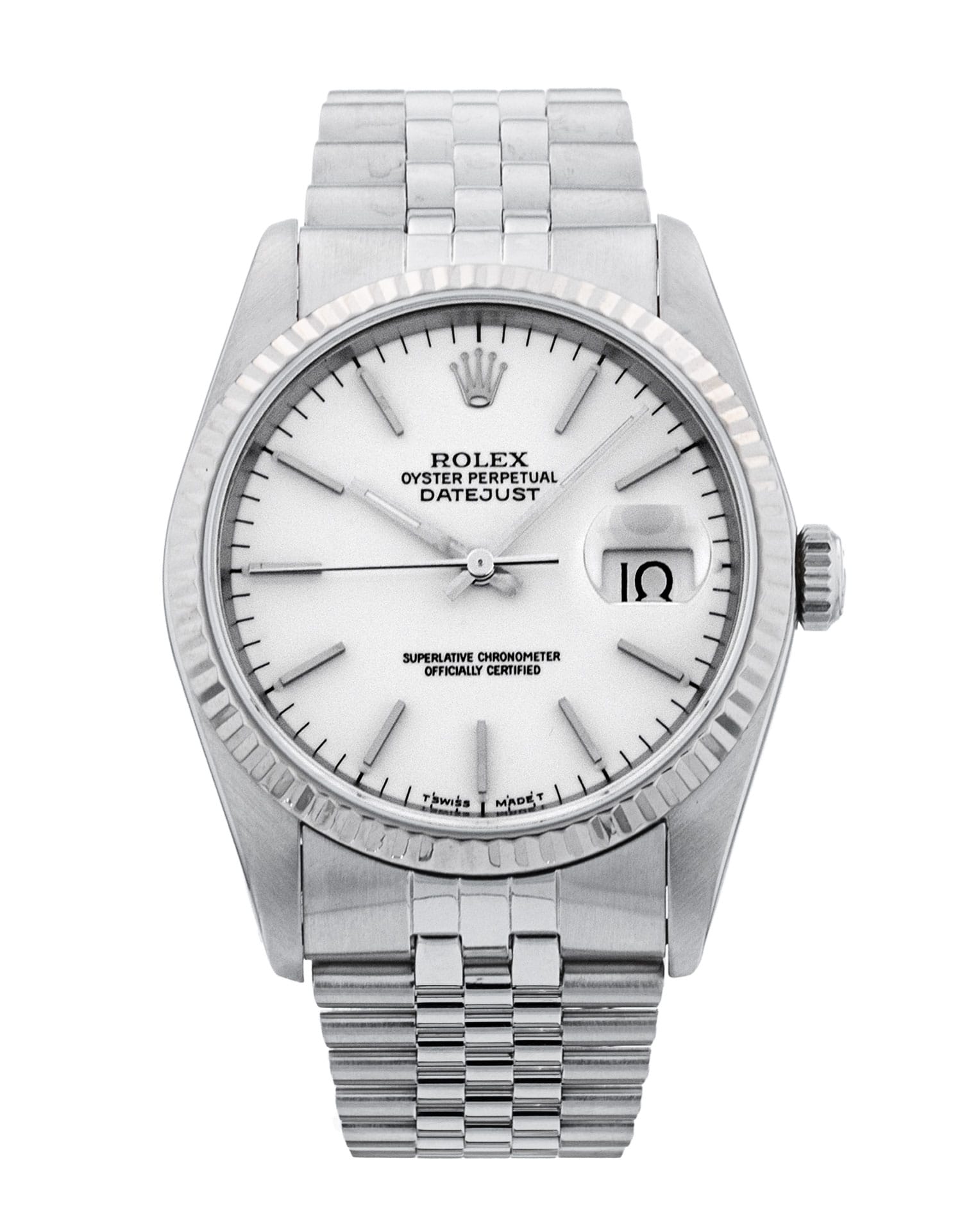 This Rolex Datejust 16234 has a white baton dial and a bracelet strap. This Rolex has undergone a thorough inspection of water resistance, accuracy, functionality and condition to determine the level of reconditioning required to meet our strict standards. It has also been referenced against technical documents and manufacturer records where available to ensure authenticity and a clean history. All our watches have a 24-month warranty for your peace of mind. One of our skilled polishing technicians has removed marks on the case and bracelet of this watch, brought about by daily wear and tear, which is why this watch does not come with the remaining manufacturer’s warranty.