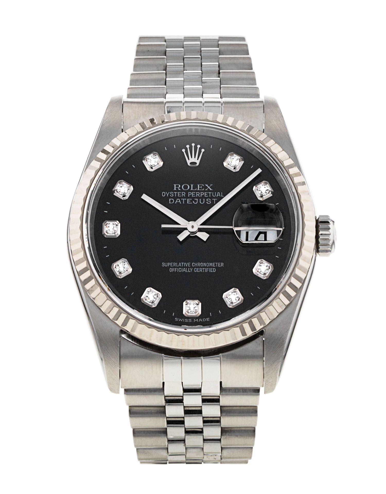 This Rolex Datejust 16234 has a black diamond dial and a bracelet strap. This Rolex has undergone a thorough inspection of water resistance, accuracy, functionality and condition to determine the level of reconditioning required to meet our strict standards. It has also been referenced against technical documents and manufacturer records where available to ensure authenticity and a clean history. All our watches have a 24-month warranty for your peace of mind. One of our skilled polishing technicians has removed marks on the case and bracelet of this watch, brought about by daily wear and tear, which is why this watch does not come with the remaining manufacturer’s warranty.