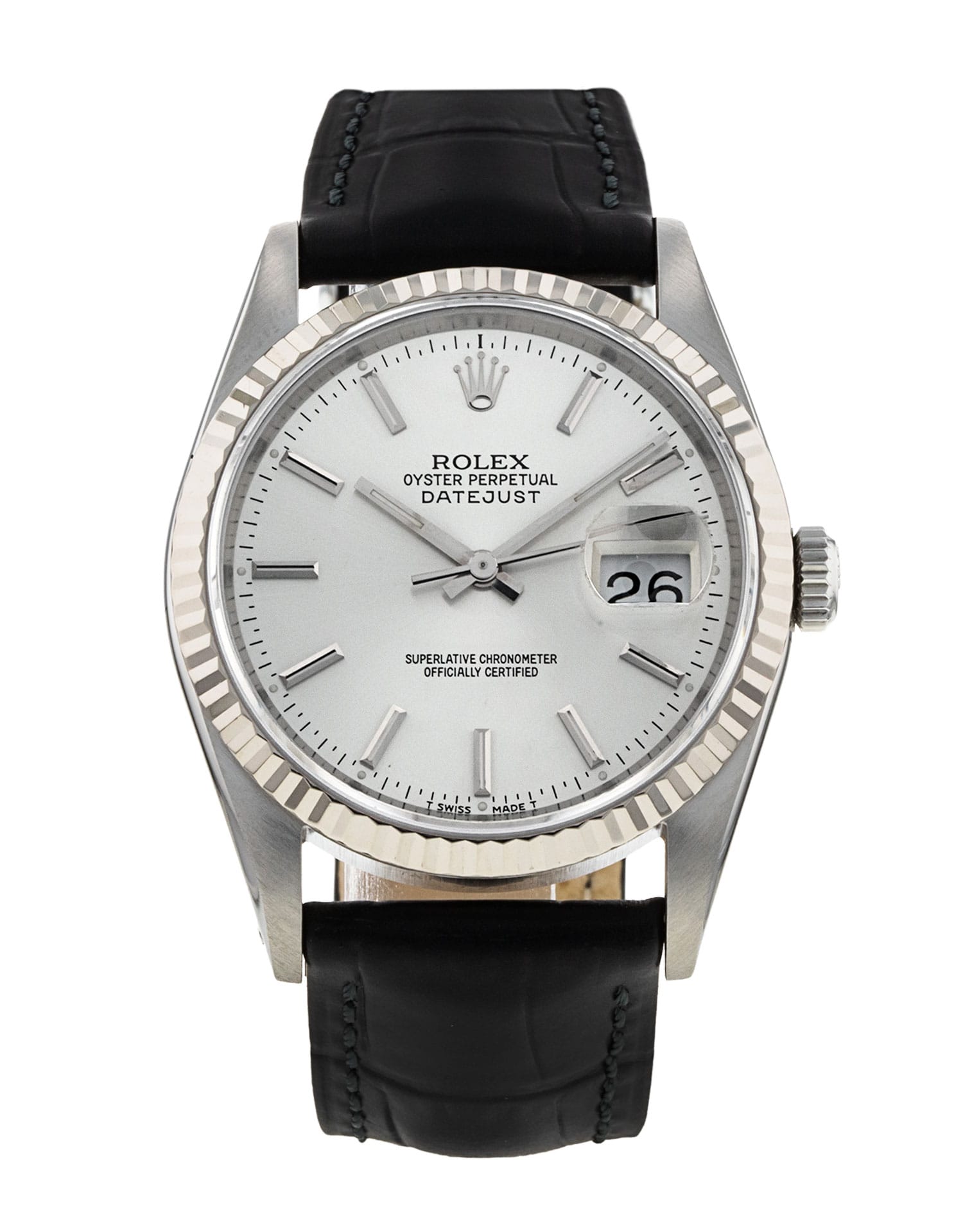 This Rolex Datejust 16234 has a silver baton dial and a leather strap. This Rolex has undergone a thorough inspection of water resistance, accuracy, functionality and condition to determine the level of reconditioning required to meet our strict standards. It has also been referenced against technical documents and manufacturer records where available to ensure authenticity and a clean history. All our watches have a 24-month warranty for your peace of mind. One of our skilled polishing technicians has removed marks on the case and bracelet of this watch, brought about by daily wear and tear, which is why this watch does not come with the remaining manufacturer’s warranty.