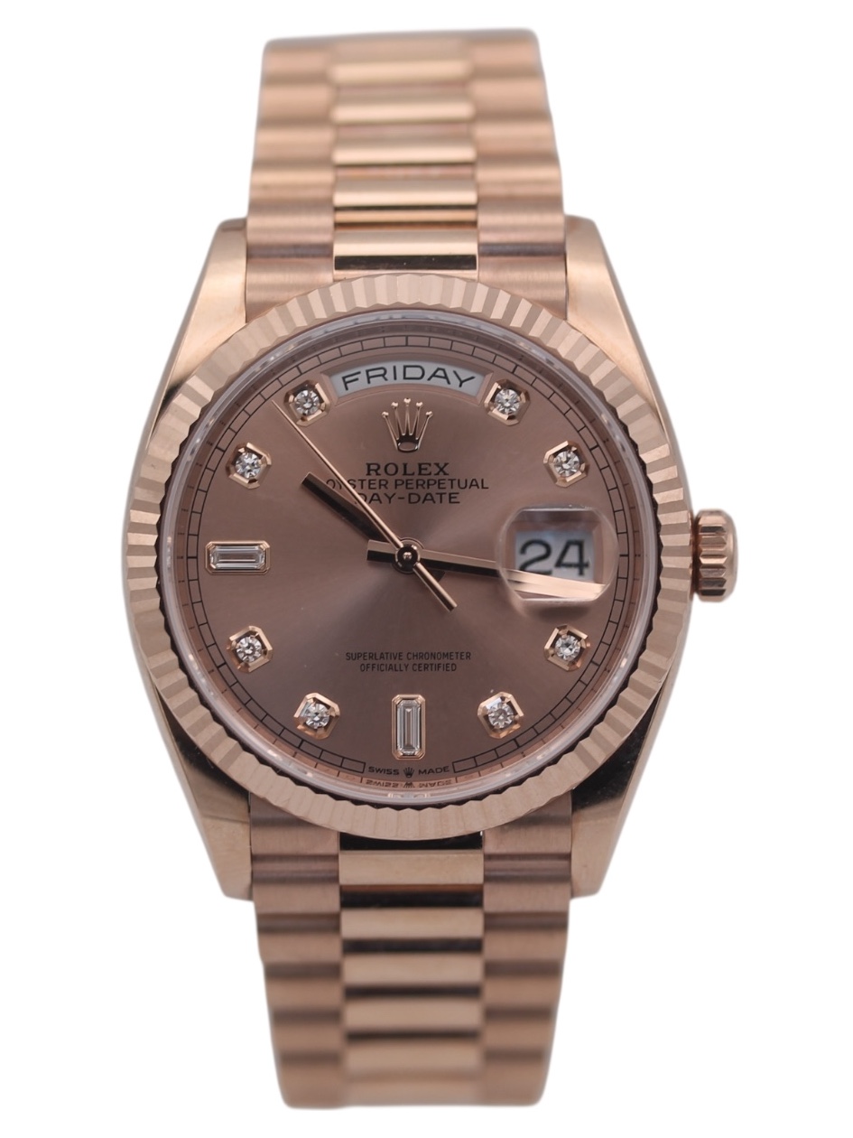 This Rolex Day-Date 36 128235 has a rose diamond dial and a bracelet strap. This Rolex has undergone a thorough inspection of water resistance, accuracy, functionality and condition to determine the level of reconditioning required to meet our strict standards. It has also been referenced against technical documents and manufacturer records where available to ensure authenticity and a clean history. Our watches have a 24-month warranty for your peace of mind, in conjunction with any remaining manufacturer’s warranty from new or from service. To maintain the manufacturer’s warranty on this watch, it has not been polished in our service centre.