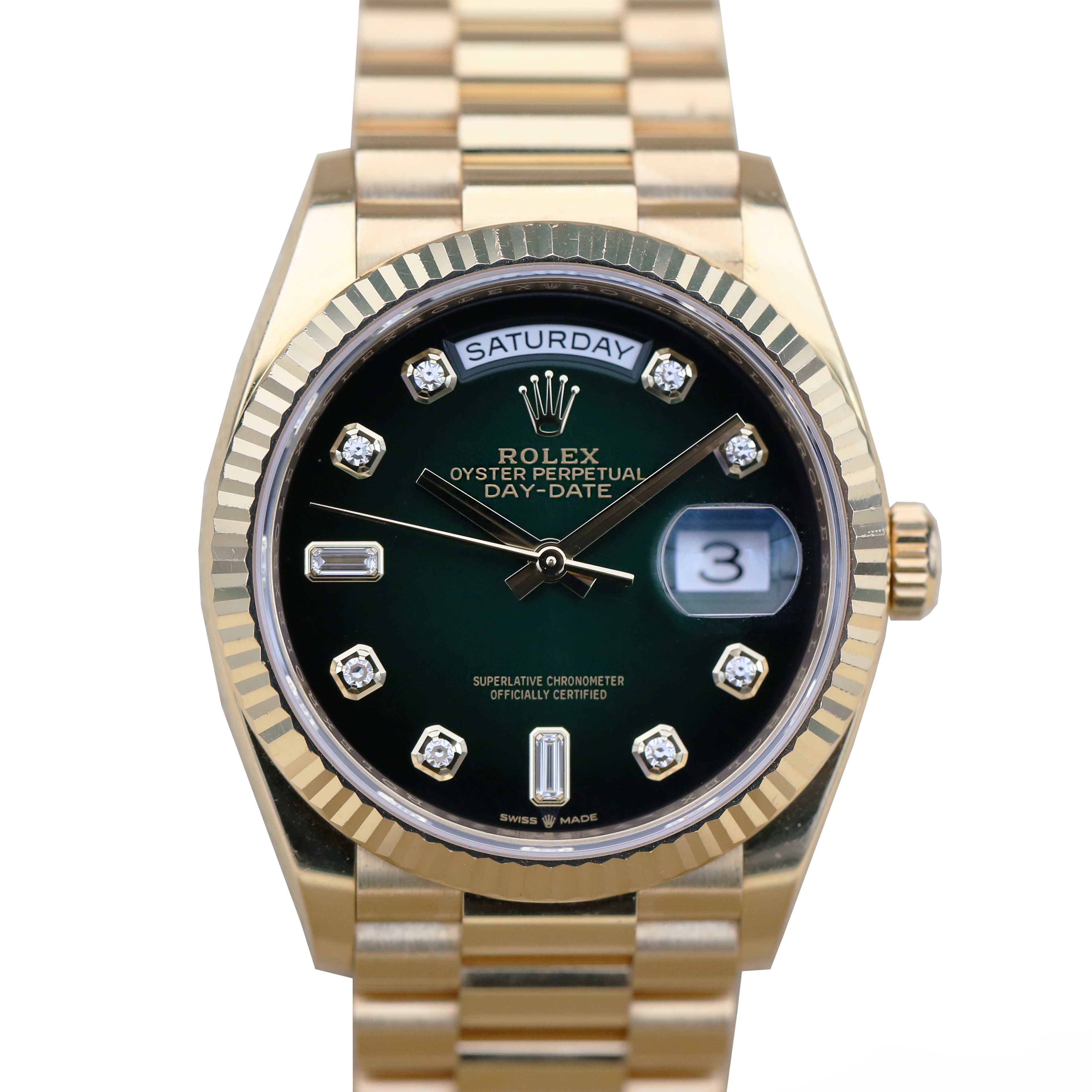 This Rolex Day-Date 36 128238 has a green ombre dial and a bracelet strap. This Rolex has undergone a thorough inspection of water resistance, accuracy, functionality and condition to determine the level of reconditioning required to meet our strict standards. It has also been referenced against technical documents and manufacturer records where available to ensure authenticity and a clean history. Our watches have a 24-month warranty for your peace of mind, in conjunction with any remaining manufacturer’s warranty from new or from service. To maintain the manufacturer’s warranty on this watch, it has not been polished in our service centre.