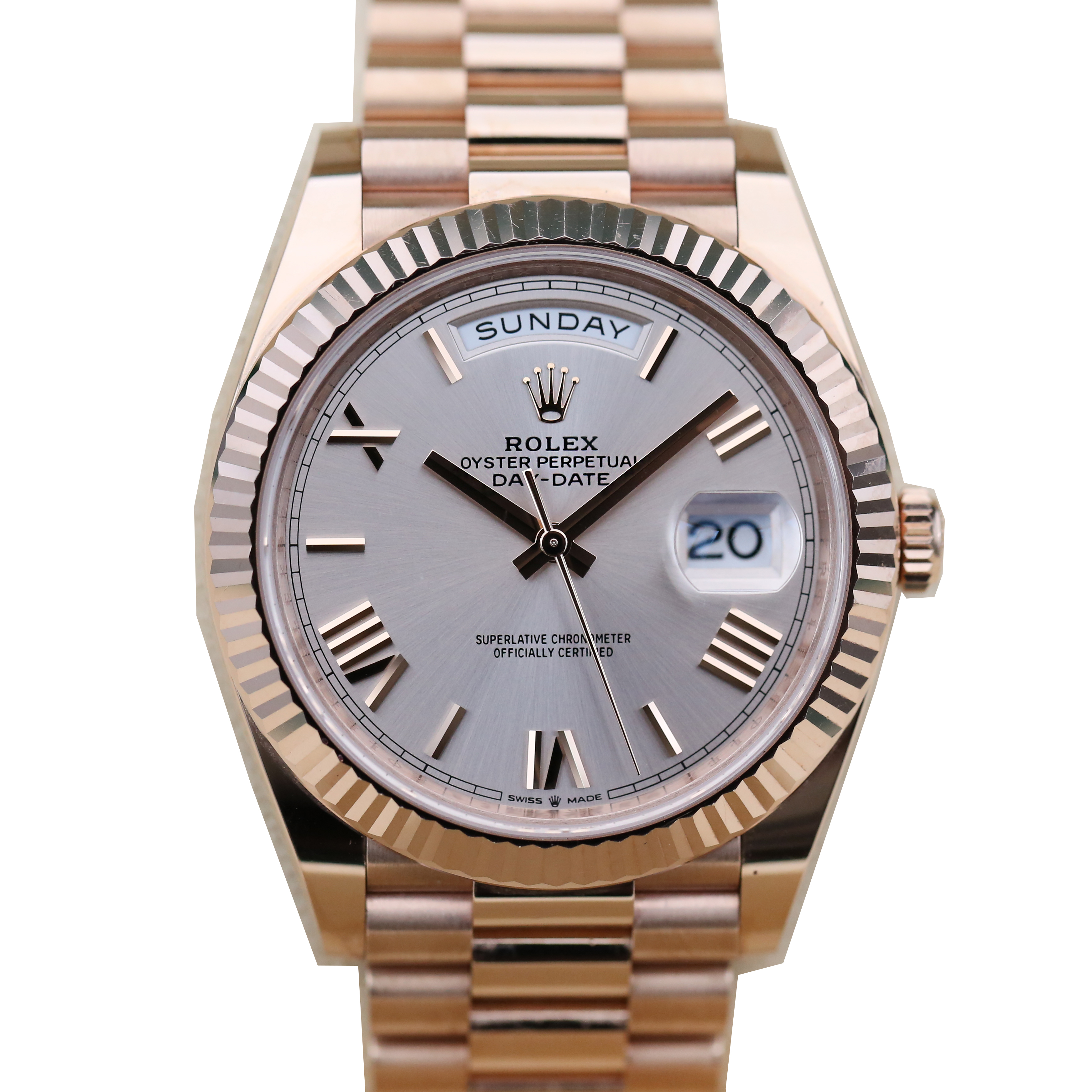 This Rolex Day-Date 40 228235 has a sundust roman numeral dial and a bracelet strap. This Rolex has undergone a thorough inspection of water resistance, accuracy, functionality and condition to determine the level of reconditioning required to meet our strict standards. It has also been referenced against technical documents and manufacturer records where available to ensure authenticity and a clean history. Our watches have a 24-month warranty for your peace of mind, in conjunction with any remaining manufacturer’s warranty from new or from service. To maintain the manufacturer’s warranty on this watch, it has not been polished in our service centre.