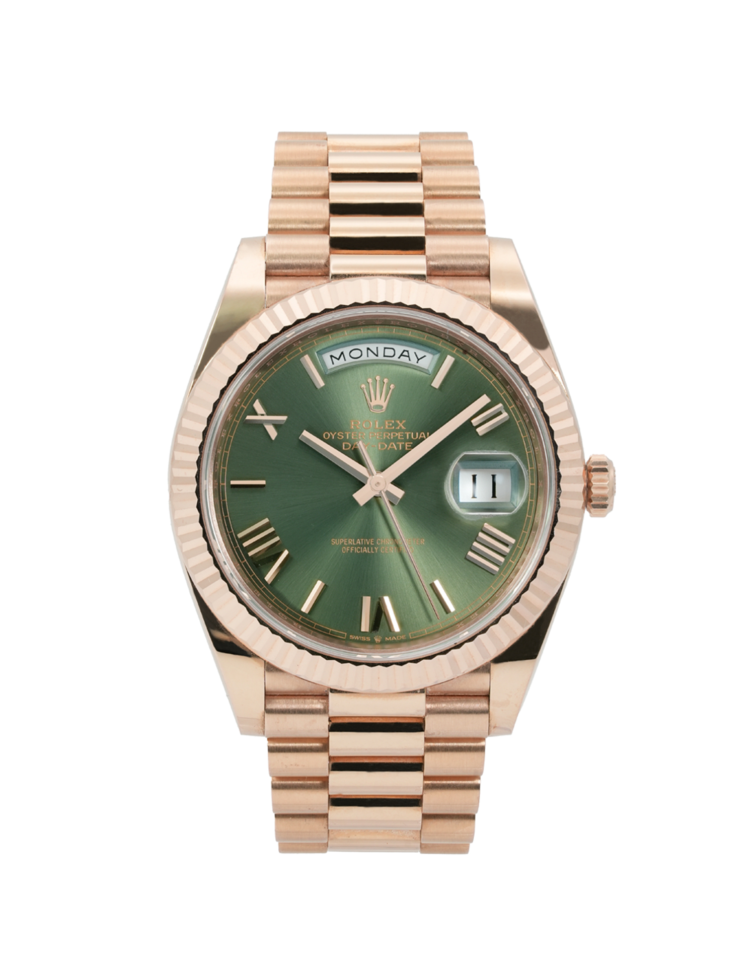 One of Rolex's most prestigious collections, famously favoured by Presidents and Prime Ministers, the Day-Date originated in 1956 and earned its name from a special new movement that showed not just the date (at 3 o'clock) but also the day of the week in a regal looking window at 12. The watch is also known for being among the first to be officially labelled "Superlative Chronometer Officially Certified" on the dial, thanks to its excellent 1055 movement. In 2015, Rolex introduced a new 40mm model with an enhanced, modern design and an upgraded calibre: the 3255. This superb and very special 2016 version of that watch boasts a magnificent green dial to celebrate the Day Date's 60th anniversary.