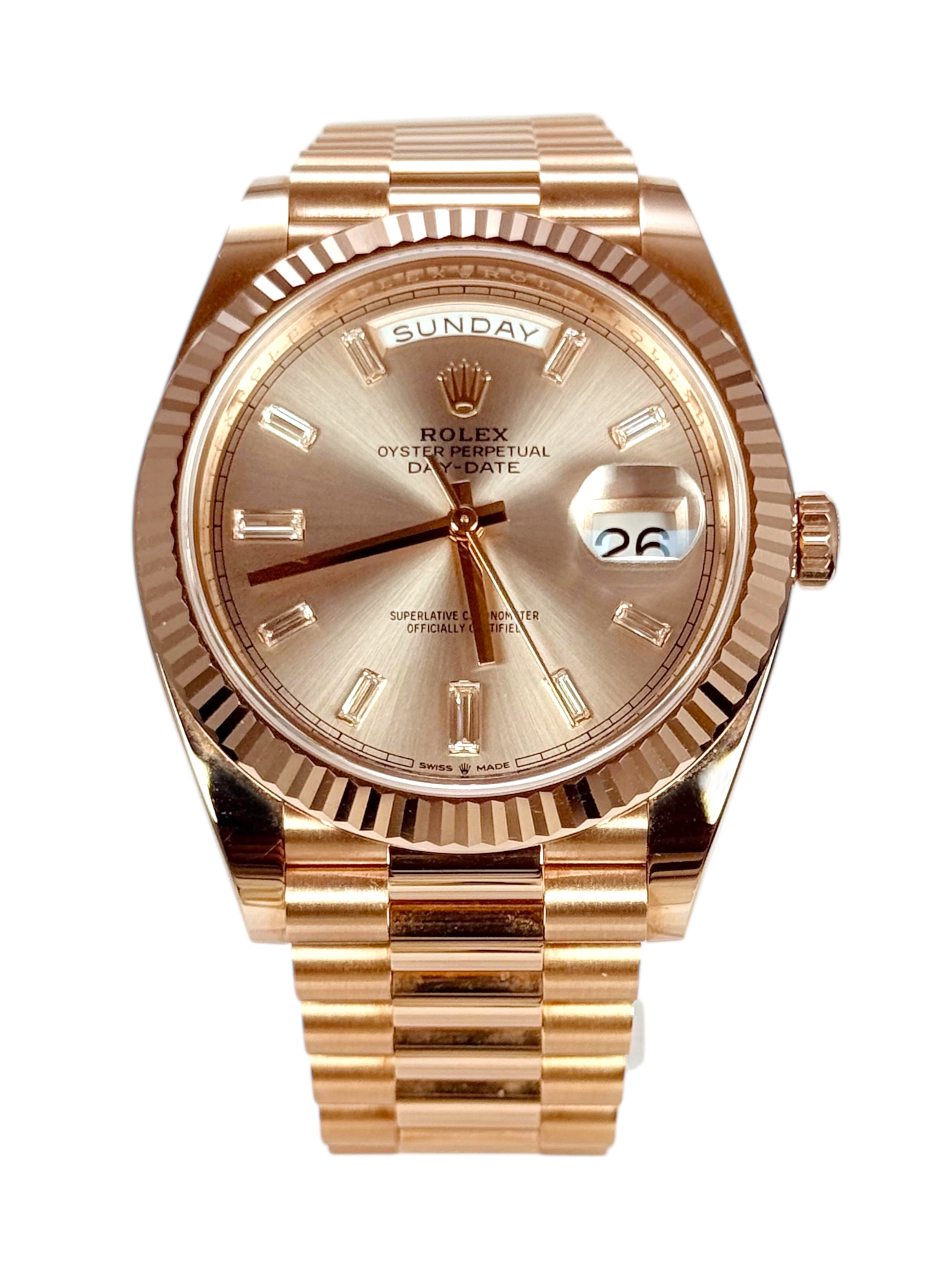 This Rolex Day-Date 40 228235 has a sundust diamond dial and a bracelet strap. This Rolex has undergone a thorough inspection of water resistance, accuracy, functionality and condition to determine the level of reconditioning required to meet our strict standards. It has also been referenced against technical documents and manufacturer records where available to ensure authenticity and a clean history. All our watches have a 24-month warranty for your peace of mind. One of our skilled polishing technicians has removed marks on the case and bracelet of this watch, brought about by daily wear and tear, which is why this watch does not come with the remaining manufacturer’s warranty.