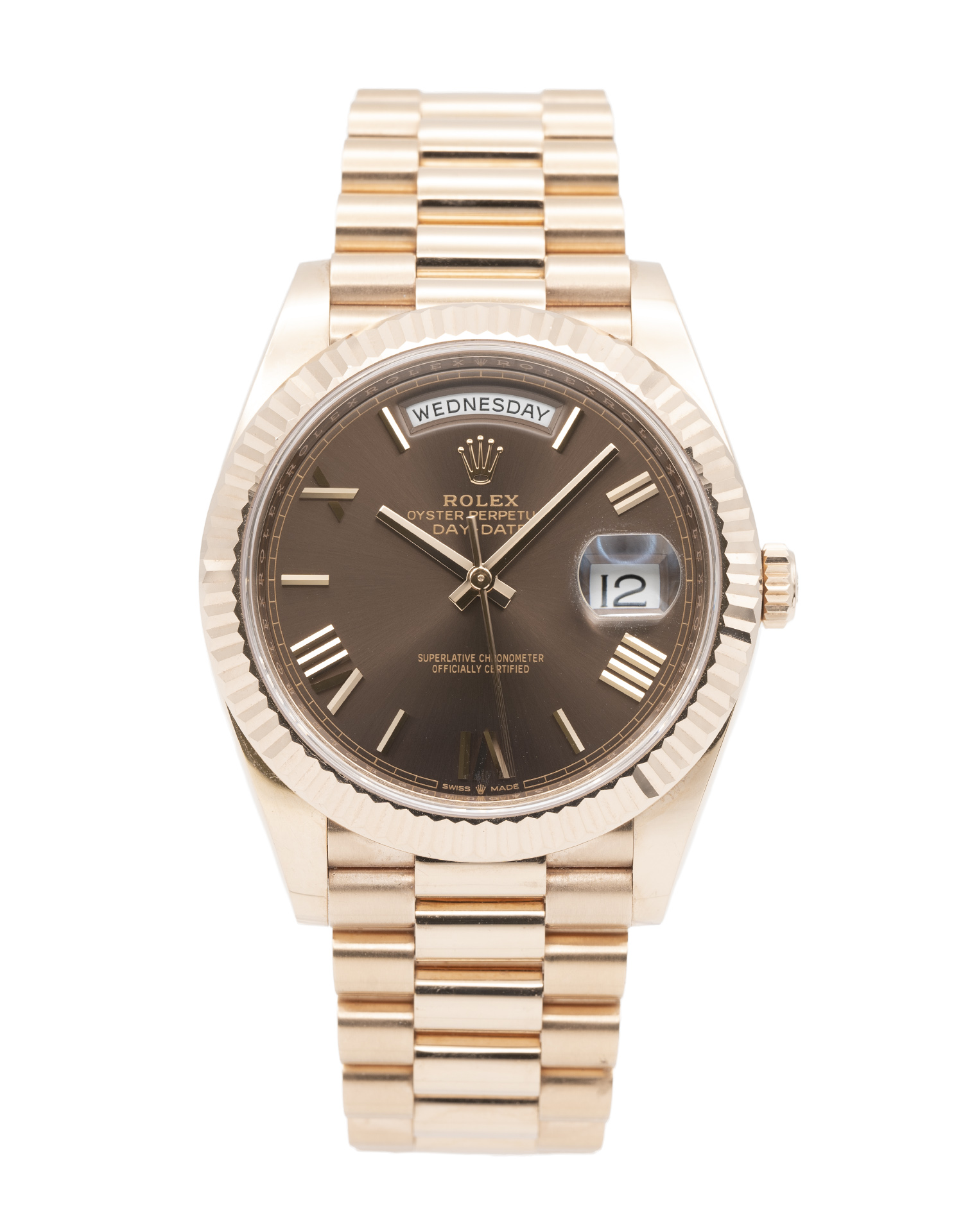 This Rolex Day-Date 40 228235 has a chocolate roman numeral dial and a bracelet strap. This Rolex has undergone a thorough inspection of water resistance, accuracy, functionality and condition to determine the level of reconditioning required to meet our strict standards. It has also been referenced against technical documents and manufacturer records where available to ensure authenticity and a clean history. All our watches have a 24-month warranty for your peace of mind. One of our skilled polishing technicians has removed marks on the case and bracelet of this watch, brought about by daily wear and tear, which is why this watch does not come with the remaining manufacturer’s warranty.