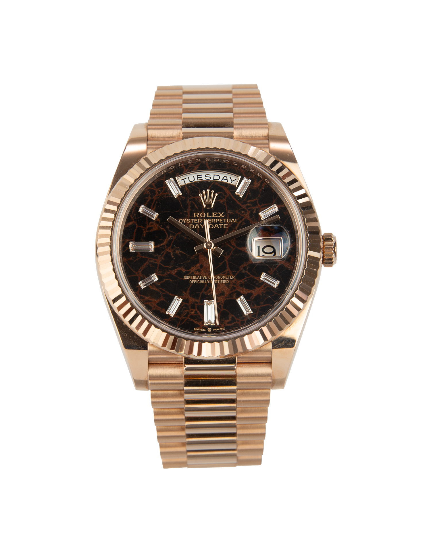 This Rolex Day-Date 40 228235 has a eisenkiesel diamond dial and a bracelet strap. This Rolex has undergone a thorough inspection of water resistance, accuracy, functionality and condition to determine the level of reconditioning required to meet our strict standards. It has also been referenced against technical documents and manufacturer records where available to ensure authenticity and a clean history. Our watches have a 24-month warranty for your peace of mind, in conjunction with any remaining manufacturer’s warranty from new or from service. To maintain the manufacturer’s warranty on this watch, it has not been polished in our service centre.