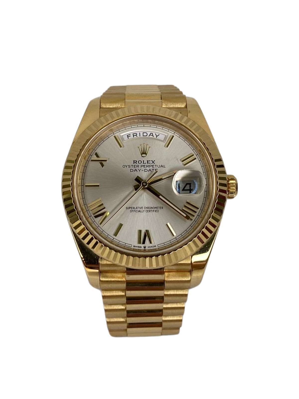 This Rolex Day-Date 40 228238 has a silver roman numeral dial and a bracelet strap. This Rolex has undergone a thorough inspection of water resistance, accuracy, functionality and condition to determine the level of reconditioning required to meet our strict standards. It has also been referenced against technical documents and manufacturer records where available to ensure authenticity and a clean history. Our watches have a 24-month warranty for your peace of mind, in conjunction with any remaining manufacturer’s warranty from new or from service. To maintain the manufacturer’s warranty on this watch, it has not been polished in our service centre.