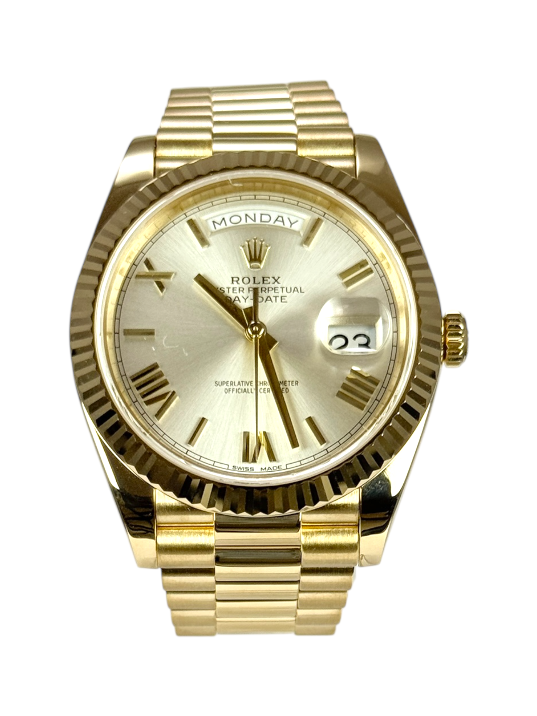 This Rolex Day-Date 40 228238 has a silver roman numeral dial and a bracelet strap. This Rolex has undergone a thorough inspection of water resistance, accuracy, functionality and condition to determine the level of reconditioning required to meet our strict standards. It has also been referenced against technical documents and manufacturer records where available to ensure authenticity and a clean history. All our watches have a 24-month warranty for your peace of mind. One of our skilled polishing technicians has removed marks on the case and bracelet of this watch, brought about by daily wear and tear, which is why this watch does not come with the remaining manufacturer’s warranty.