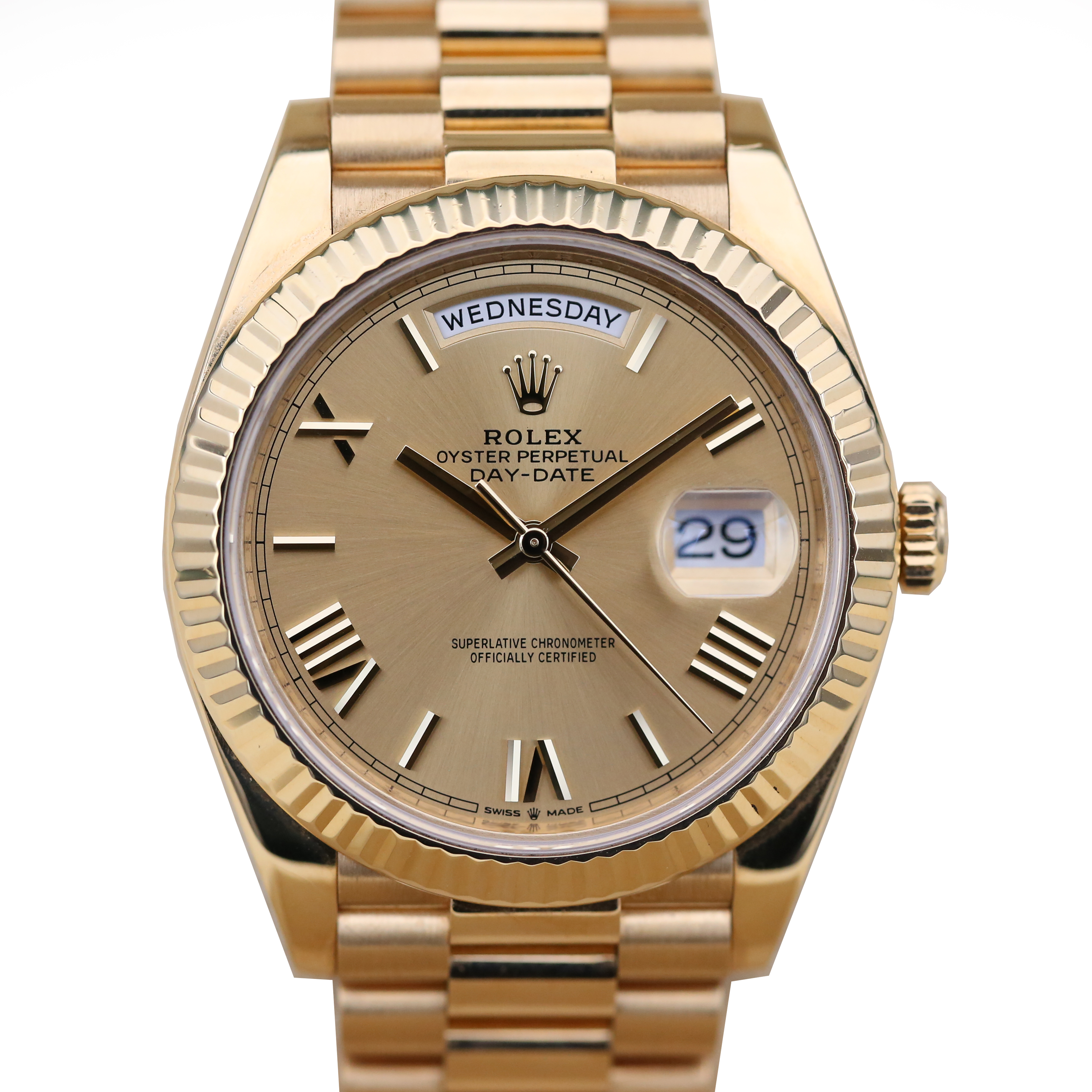 This Rolex Day-Date 40 228238 has a champagne roman numeral dial and a bracelet strap. This Rolex has undergone a thorough inspection of water resistance, accuracy, functionality and condition to determine the level of reconditioning required to meet our strict standards. It has also been referenced against technical documents and manufacturer records where available to ensure authenticity and a clean history. All our watches have a 24-month warranty for your peace of mind. One of our skilled polishing technicians has removed marks on the case and bracelet of this watch, brought about by daily wear and tear, which is why this watch does not come with the remaining manufacturer’s warranty.