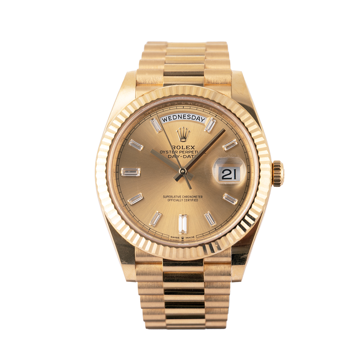 This Rolex Day-Date 40 228238 has a champagne diamond dial and a bracelet strap. This Rolex has undergone a thorough inspection of water resistance, accuracy, functionality and condition to determine the level of reconditioning required to meet our strict standards. It has also been referenced against technical documents and manufacturer records where available to ensure authenticity and a clean history. Our watches have a 24-month warranty for your peace of mind, in conjunction with any remaining manufacturer’s warranty from new or from service. To maintain the manufacturer’s warranty on this watch, it has not been polished in our service centre.