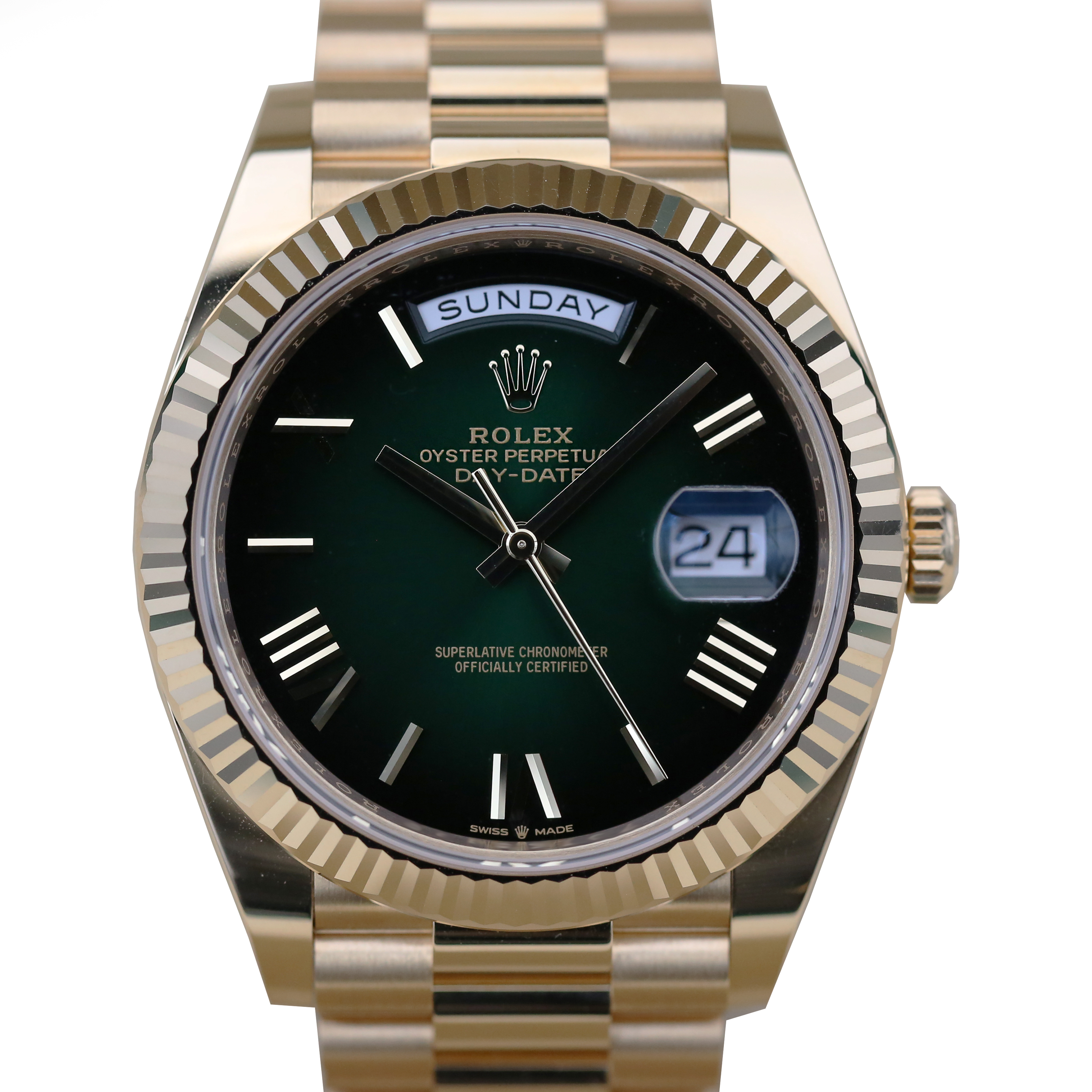 This Rolex Day-Date 40 228238 has a green ombre dial and a bracelet strap. This Rolex has undergone a thorough inspection of water resistance, accuracy, functionality and condition to determine the level of reconditioning required to meet our strict standards. It has also been referenced against technical documents and manufacturer records where available to ensure authenticity and a clean history. Our watches have a 24-month warranty for your peace of mind, in conjunction with any remaining manufacturer’s warranty from new or from service. To maintain the manufacturer’s warranty on this watch, it has not been polished in our service centre.