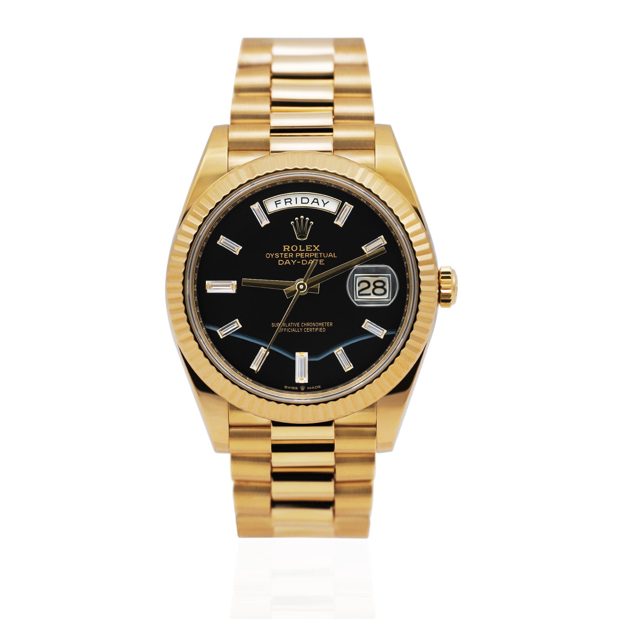 This Rolex Day-Date 40 228238 has a black onyx diamond dial and a bracelet strap. This Rolex has undergone a thorough inspection of water resistance, accuracy, functionality and condition to determine the level of reconditioning required to meet our strict standards. It has also been referenced against technical documents and manufacturer records where available to ensure authenticity and a clean history. Our watches have a 24-month warranty for your peace of mind, in conjunction with any remaining manufacturer’s warranty from new or from service. To maintain the manufacturer’s warranty on this watch, it has not been polished in our service centre.